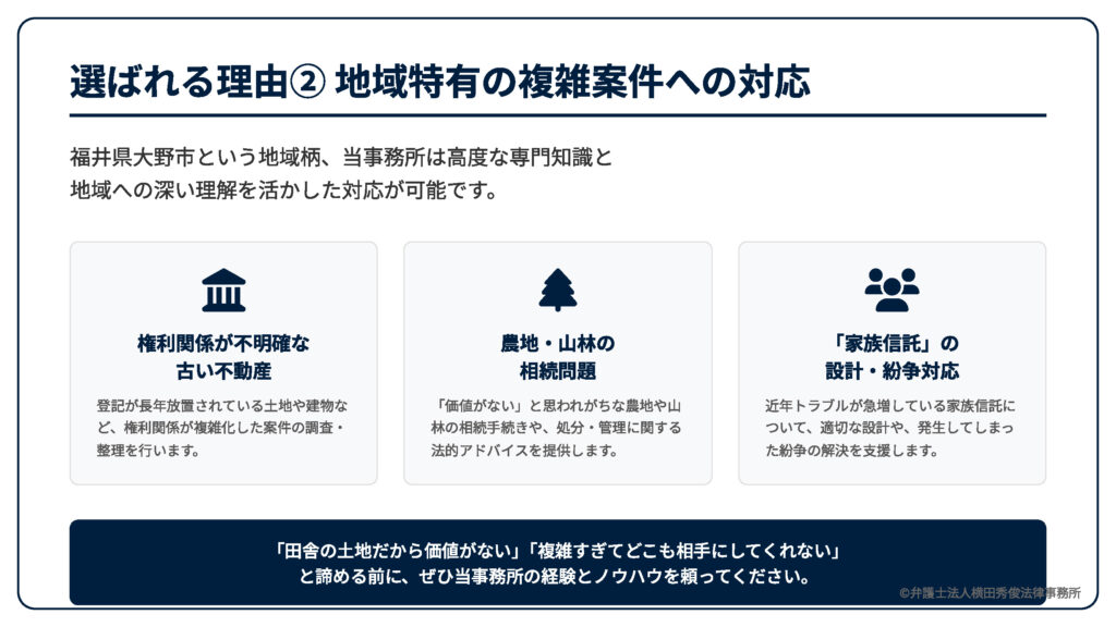 その結果、期限後であっても放棄が認められ、多額の負債から解放された事例も数多くあります。 また、福井県大野市という地域柄、権利関係が不明確な古い不動産や、農地、山林の相続問題、あるいは近年トラブルが急増している「家族信託」の設計や紛争対応など、高度な専門知識と地域への理解が必要な分野にも豊富な実績があります。