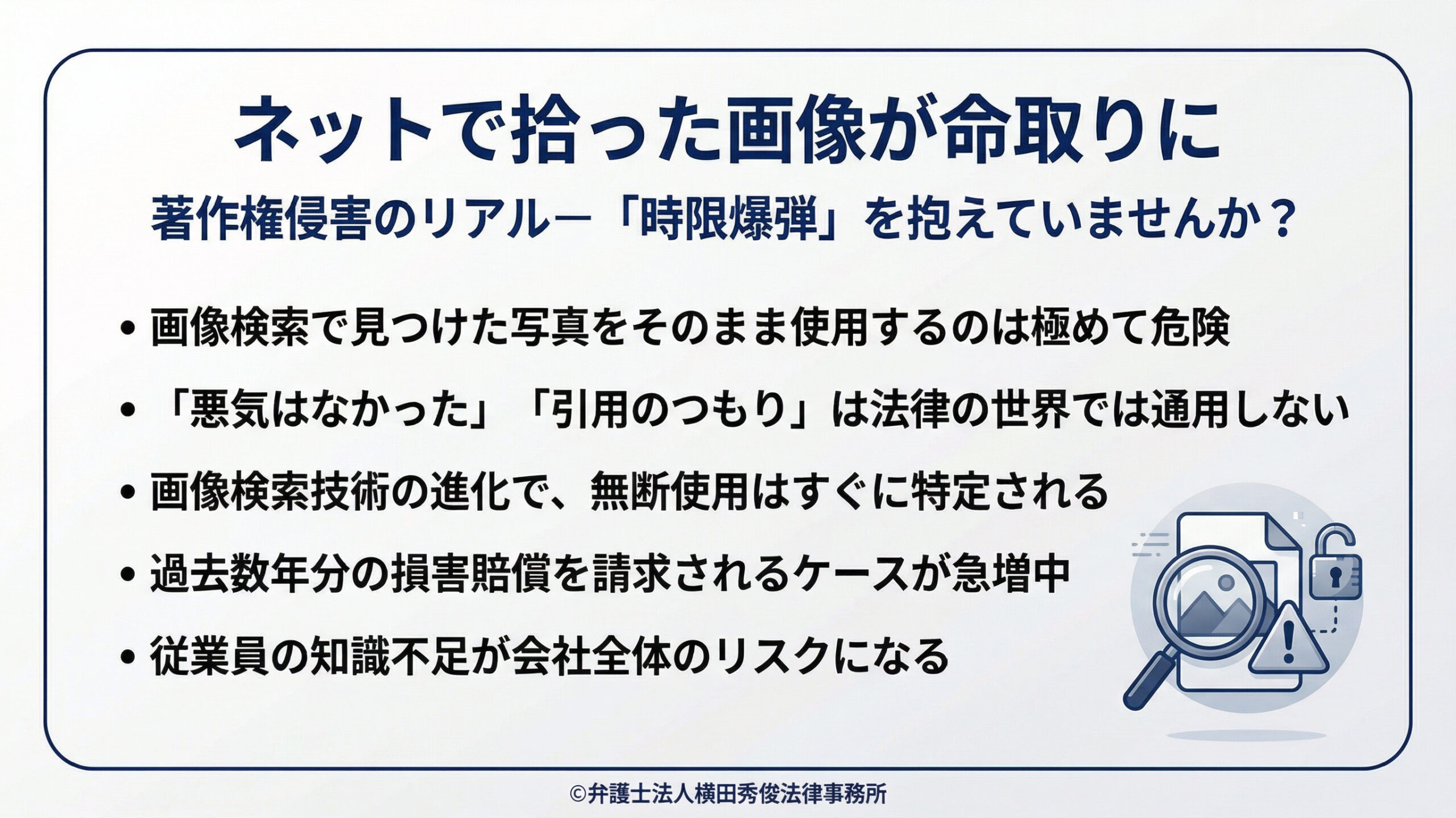 自社のブログやSNS、チラシを作成する際、「イメージに合う写真をGoogle画像検索で見つけて、そのまま貼り付けた」という経験はありませんか? もし心当たりがあるなら、それは極めて危険な状態、いわば【時限爆弾】を抱えているのと同じです。