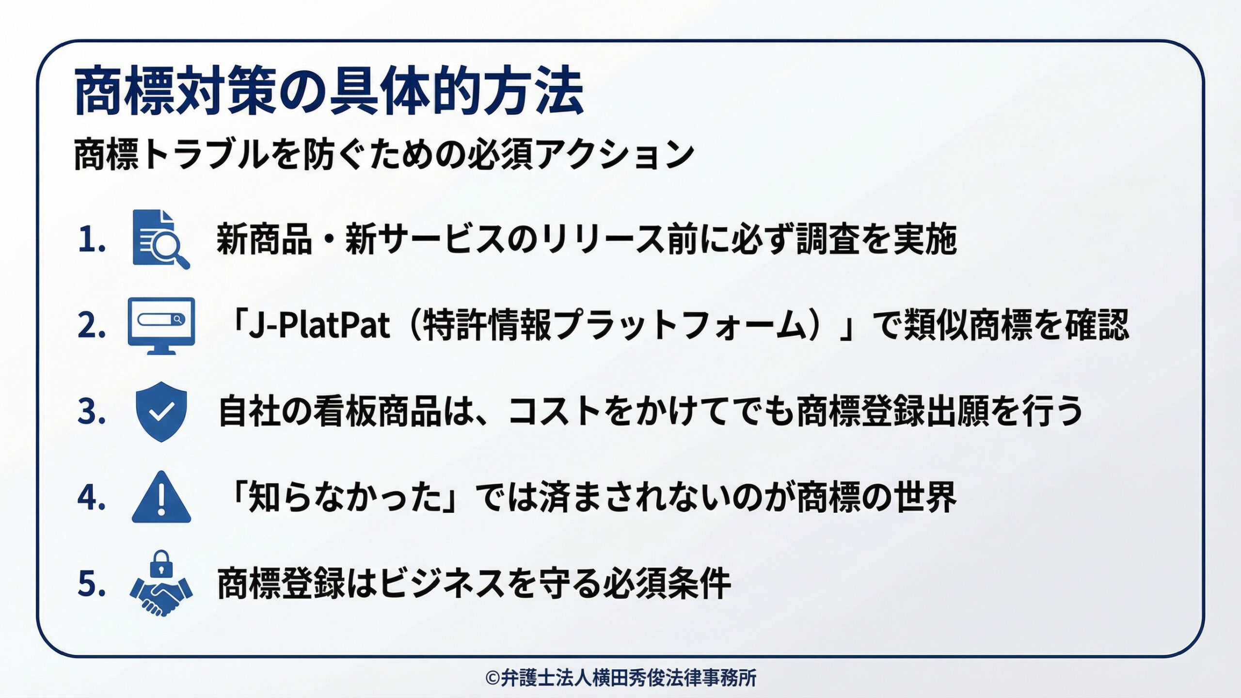 新しい名前やデザインを使う前に、必ず他人の権利を侵害していないか調査する習慣をつける。