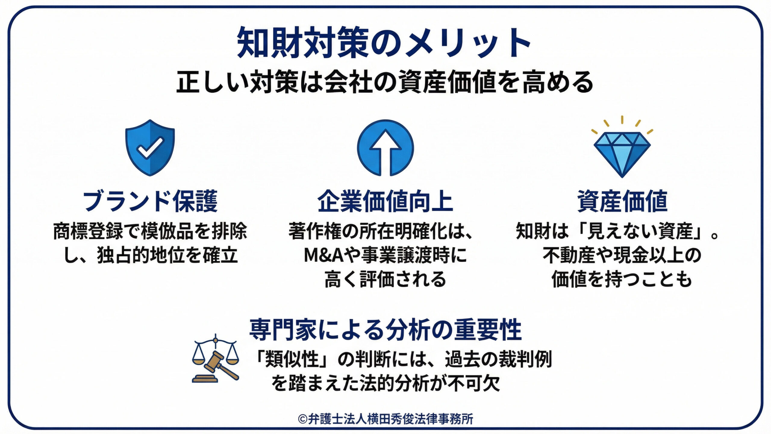 商標登録を済ませておけば、模倣品を排除し、自社ブランドの独占的な地位を築くことができます。 著作権の所在をクリアにしておけば、将来的なM&Aや事業譲渡の際にも、会社の資産価値(IP価値)として高く評価されます。