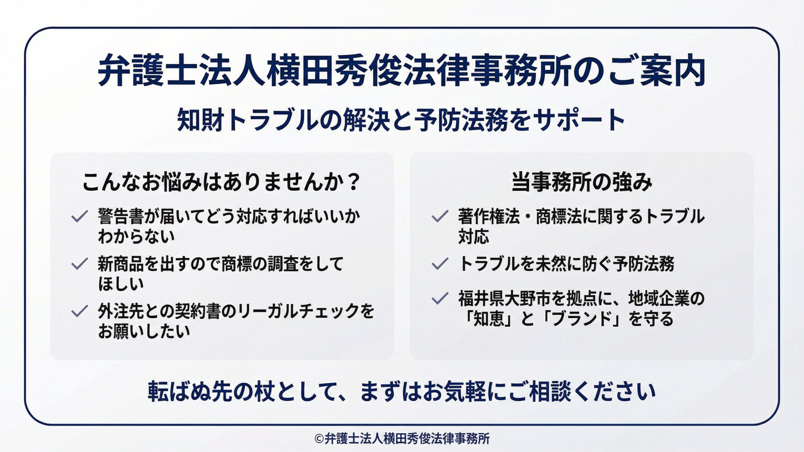 福井県大野市を拠点に、地域企業の皆様の「知恵」と「ブランド」を守るため、私たちが専門知識でサポートいたします。