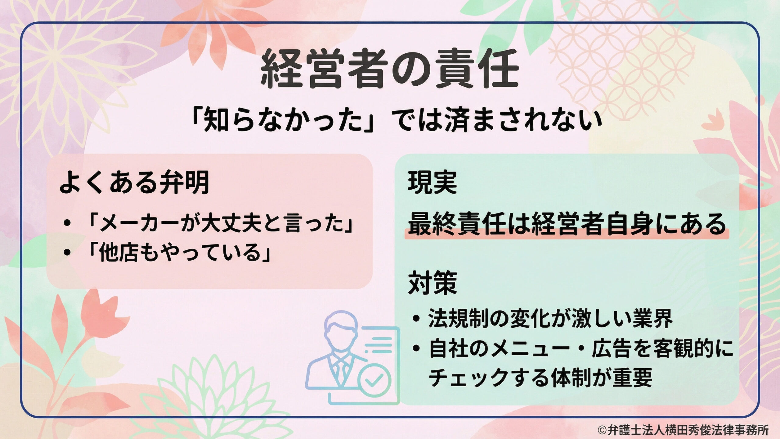 大切なのは、自社のメニューや広告表現が現在の法規制に適合しているかを、客観的にチェックし続ける体制を持つことです。