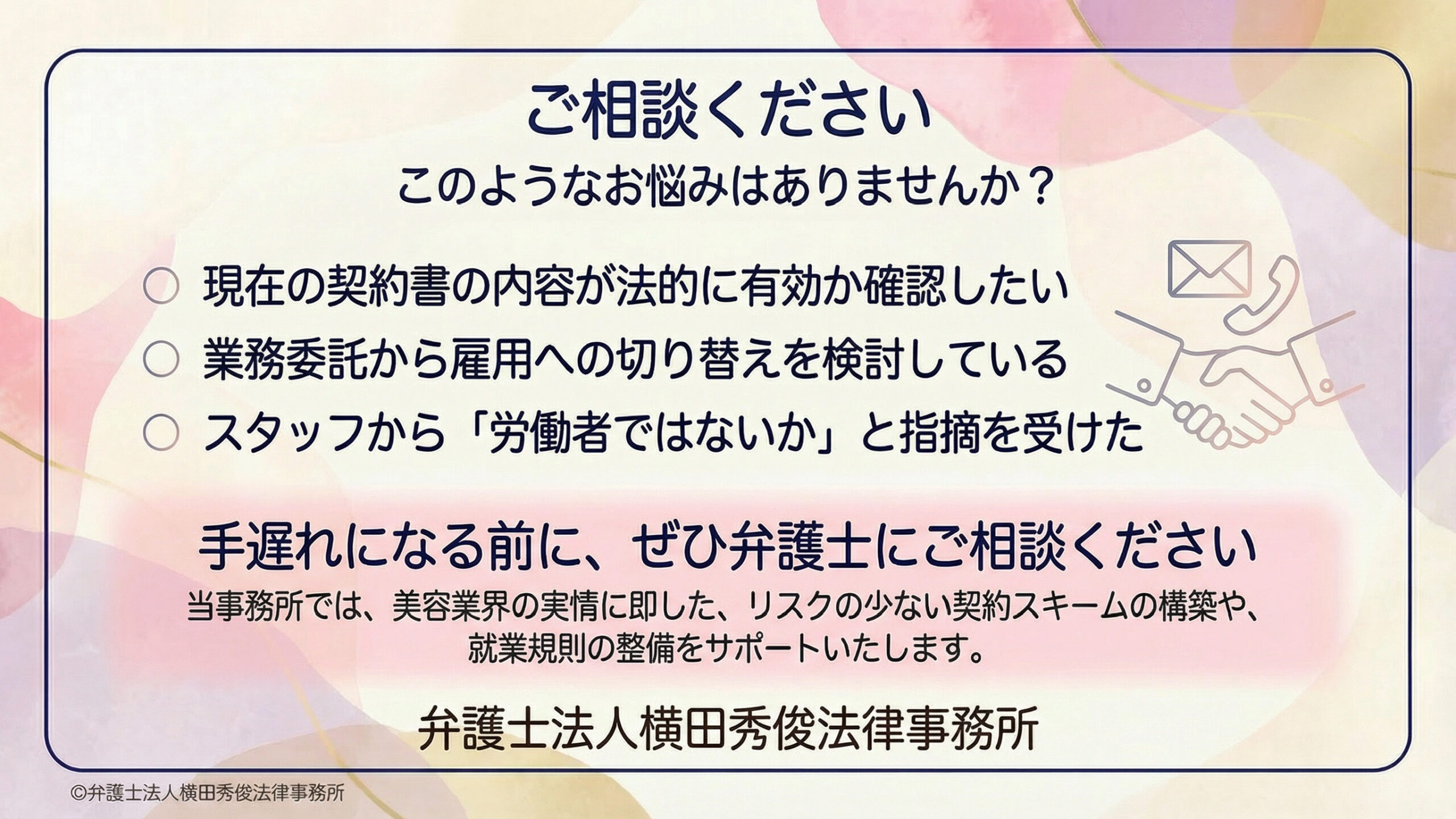 その法的な判断基準と、労働基準監督署の調査リスク、そしてサロンを守るための正しい契約運用のポイントについて、弁護士が徹底解説します。