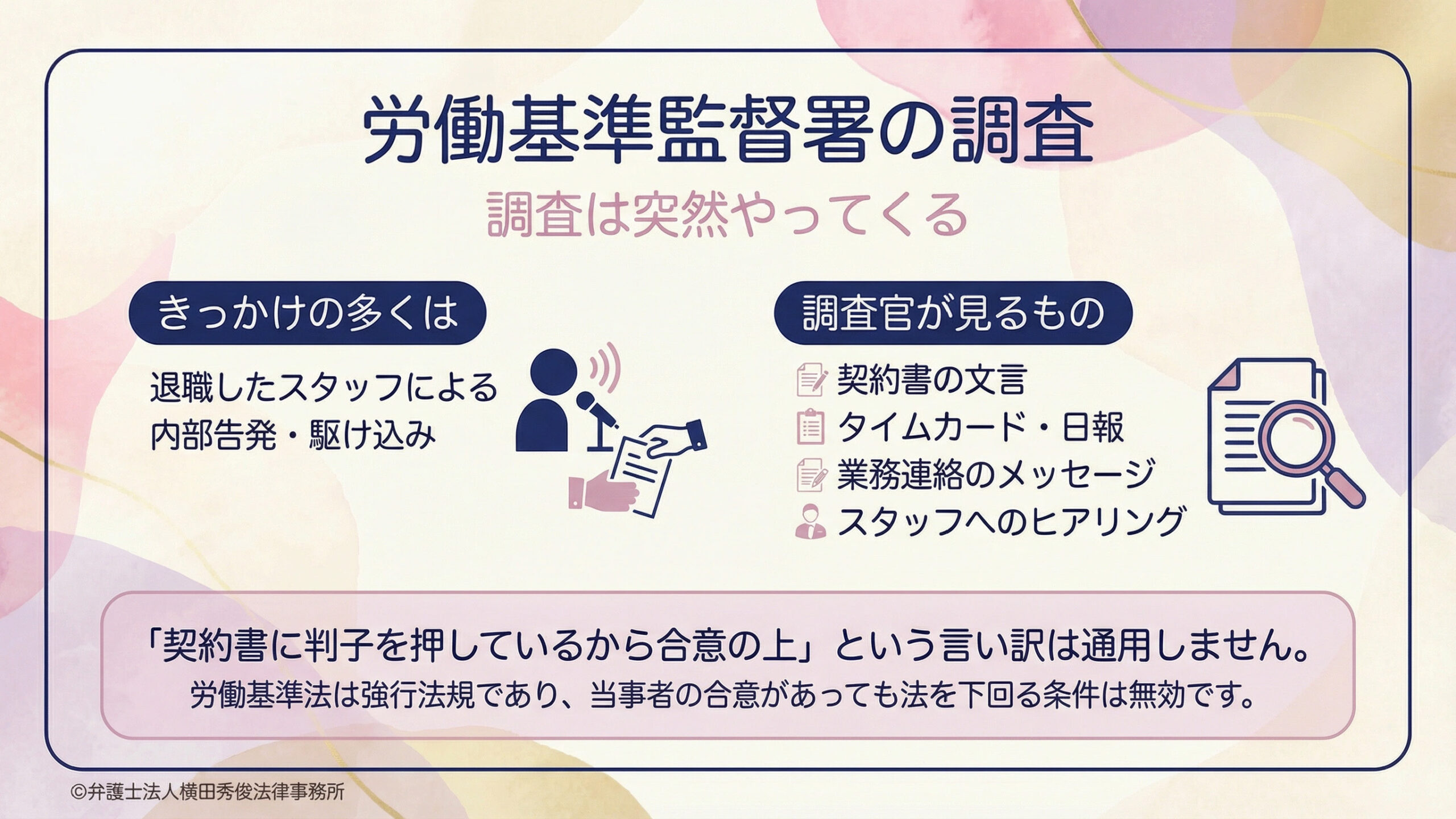 労働基準監督署の調査官は、契約書の文言だけでなく、タイムカード、日報、業務連絡のLINE、スタッフへのヒアリングなどを通じて、徹底的に「実態」を調査します。