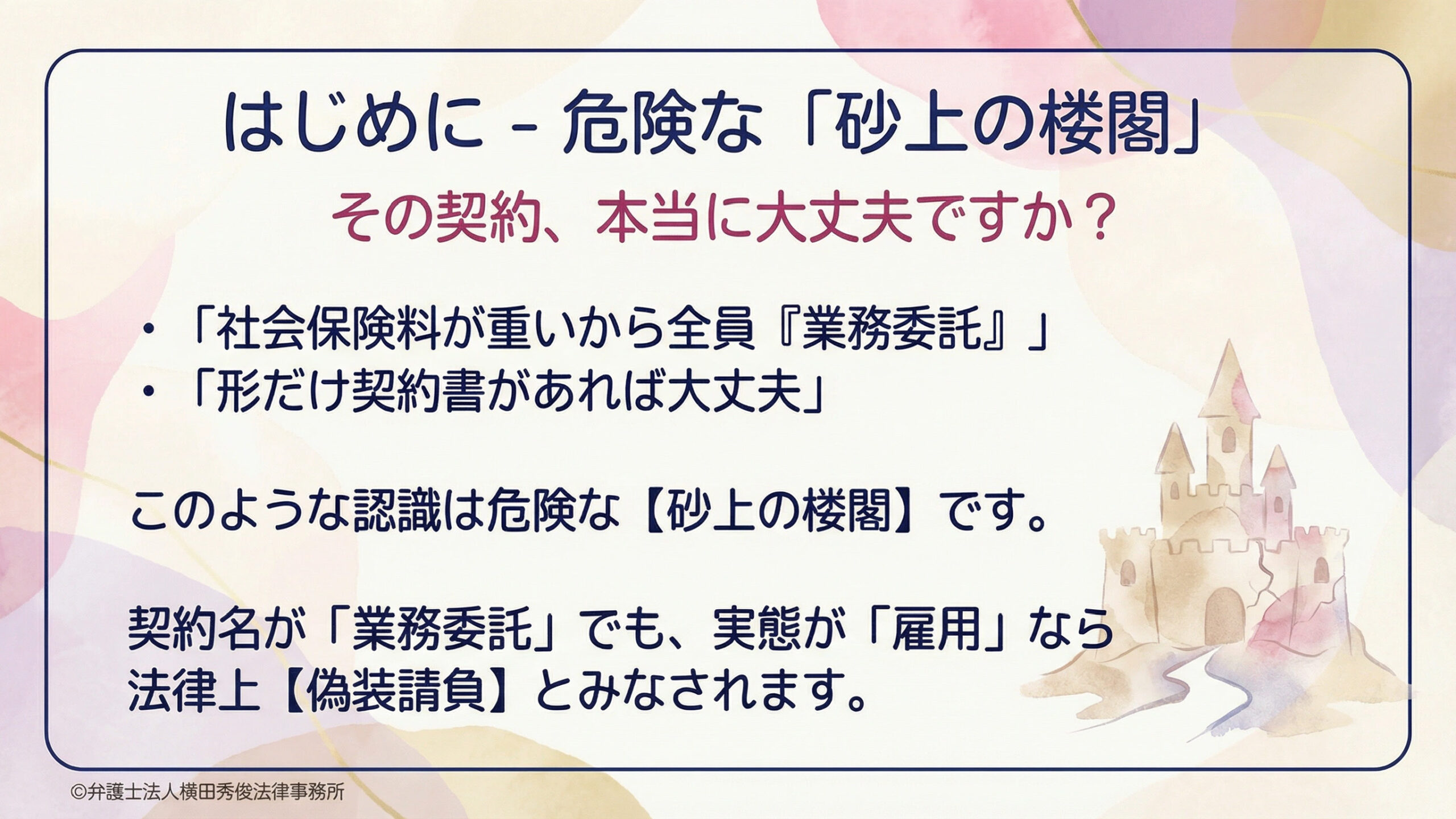日本の労働法制は、【契約の形式】ではなく【働かせ方の実態】を重視します。