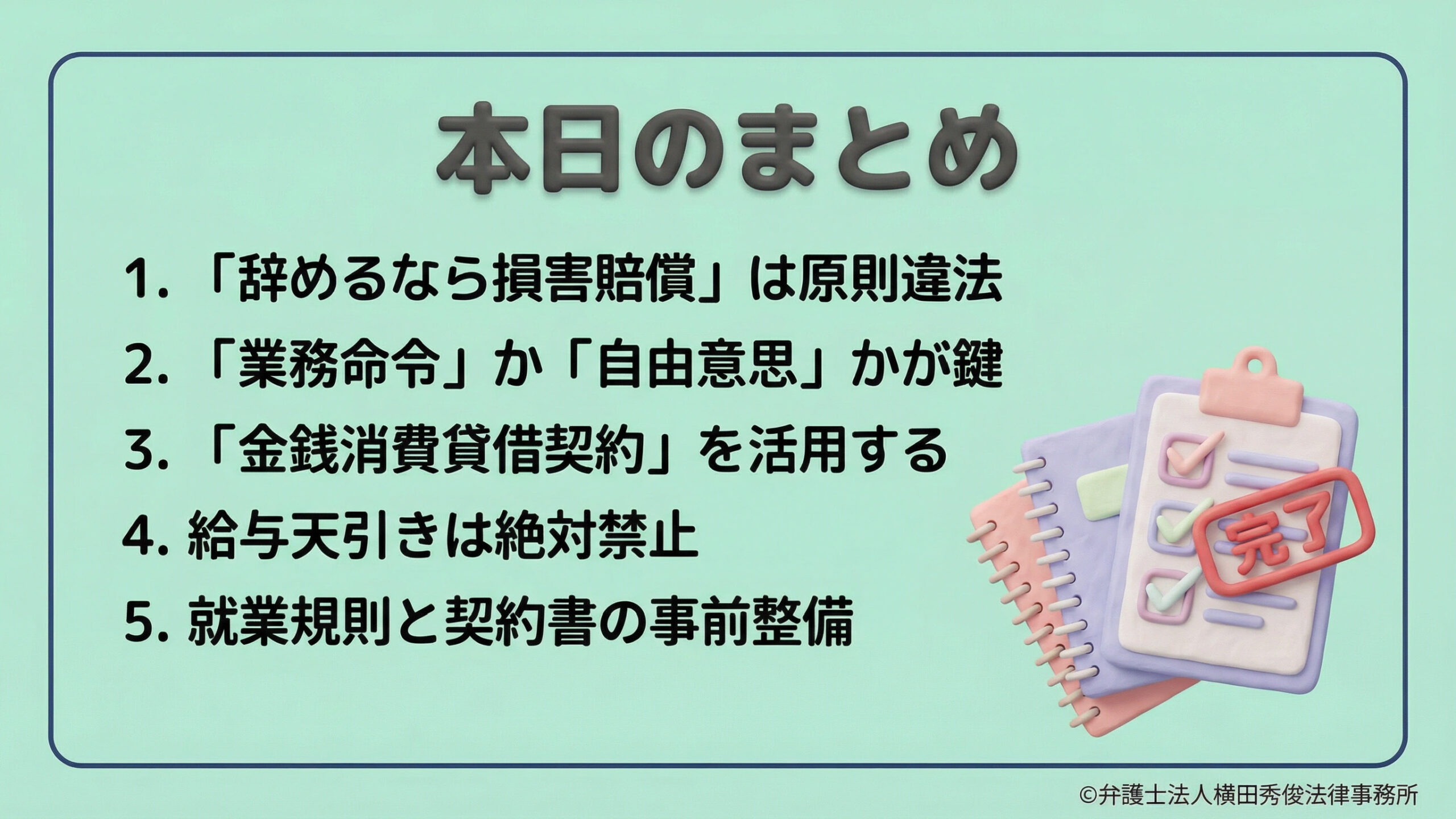 例外的に返還請求を可能にするためには、単に「辞めたら返せ」と約束させるのではなく、法的に整理された【金銭消費貸借契約(貸付制度)】を活用する必要があります。