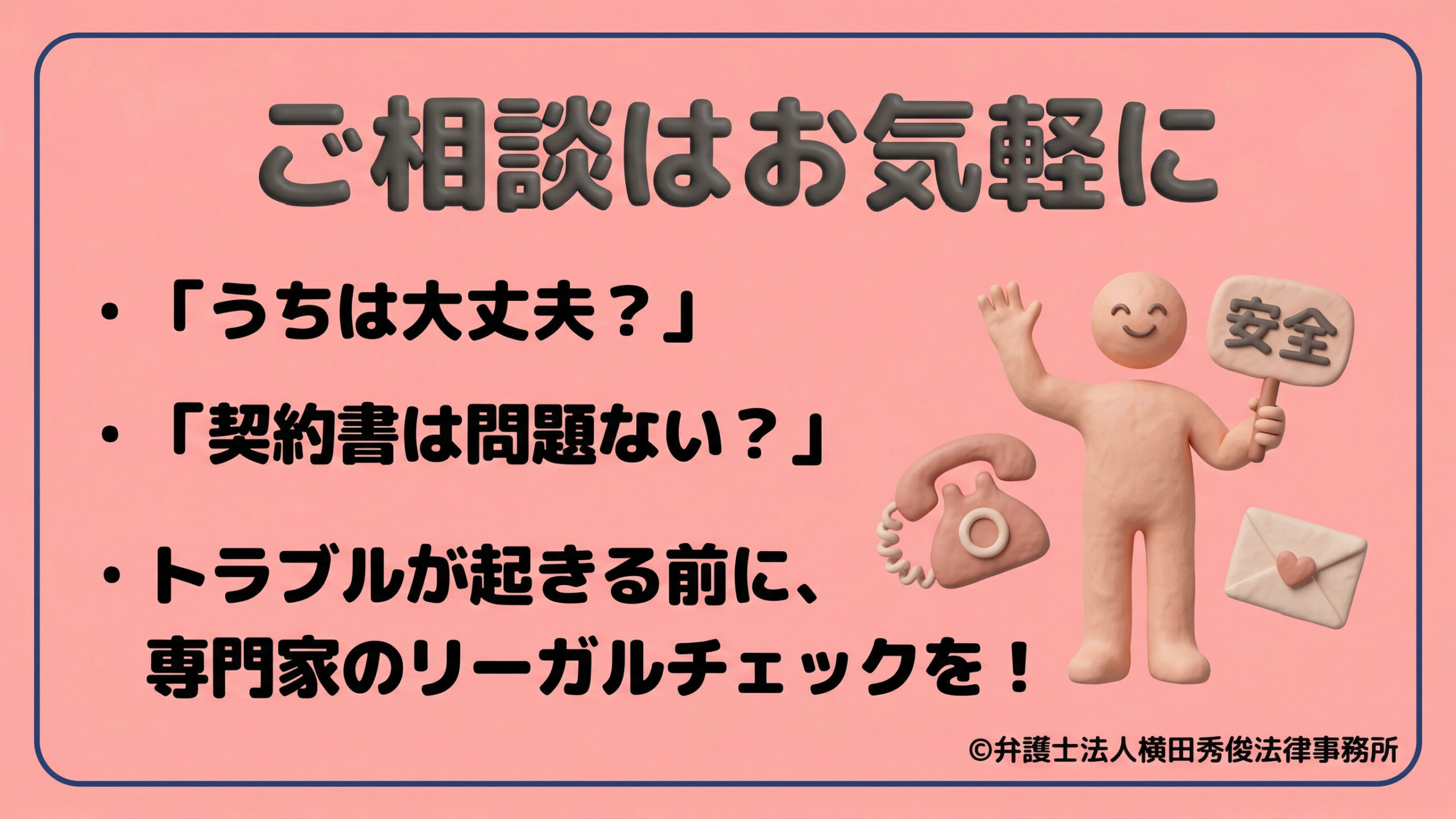 と不安に思われた経営者様は、トラブルが起きる前に、一度専門家によるリーガルチェックを受けることを強くお勧めします。