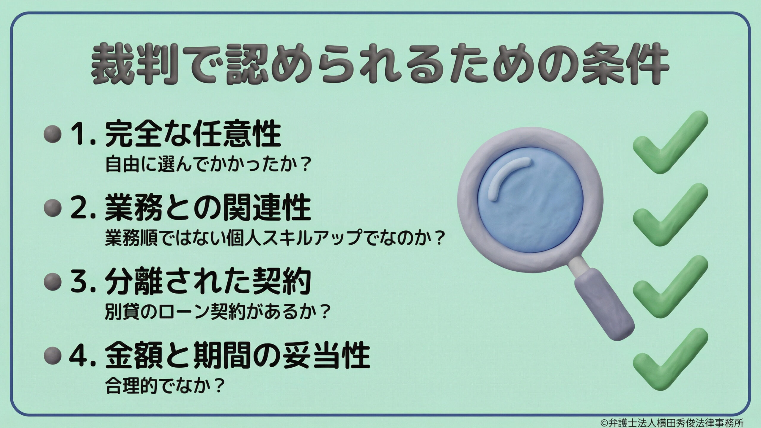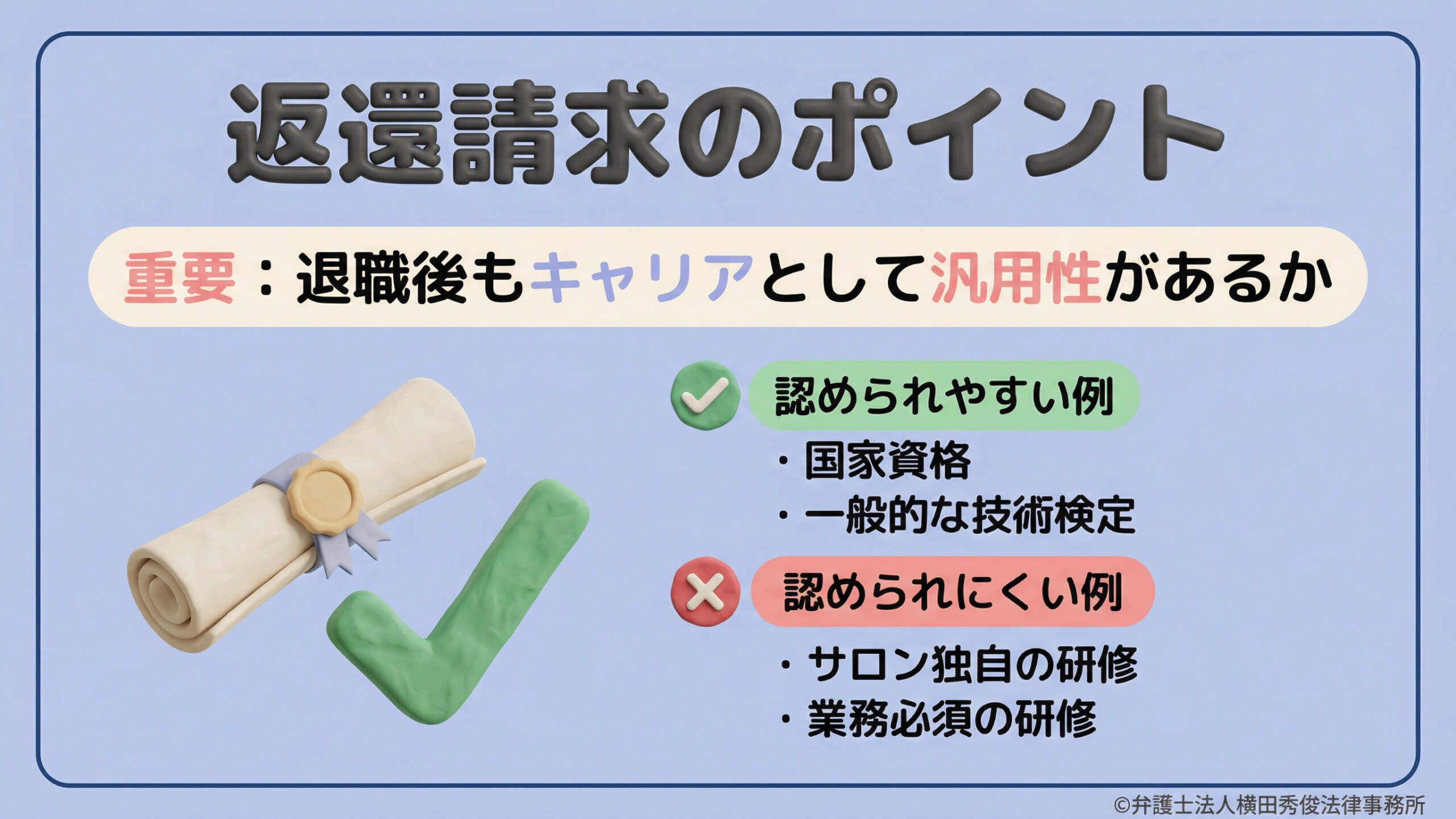 例えば、そのサロン独自の特殊なマニュアル研修ではなく、国家資格や、どの店に行っても通用する一般的な技術検定などであれば、「本人の利益」になる度合いが高いため、例外的に返還請求のスキームに乗せやすくなります。