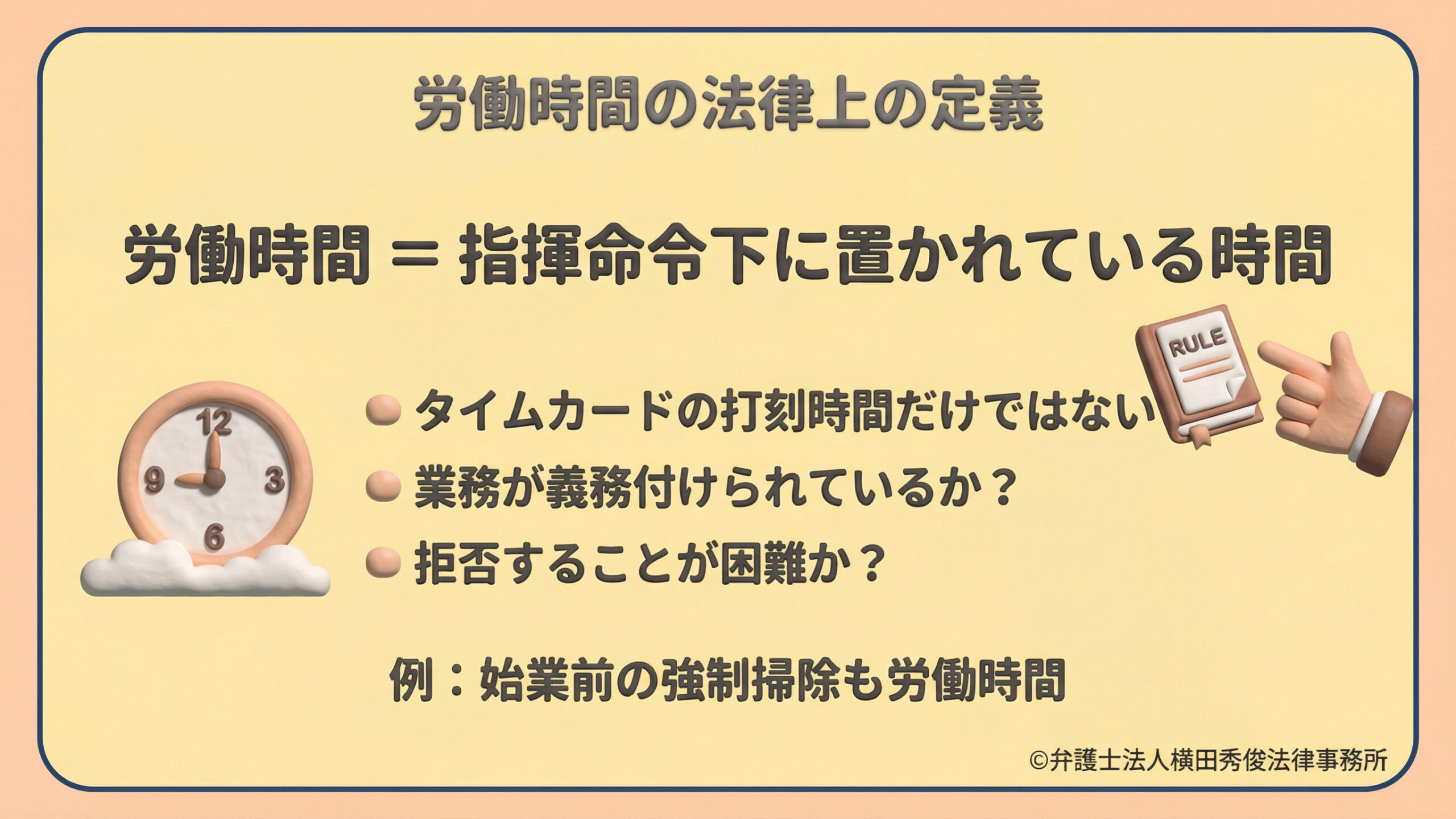 労働基準法における「労働時間」とは、単にタイムカードを打刻している時間だけを指すのではありません。