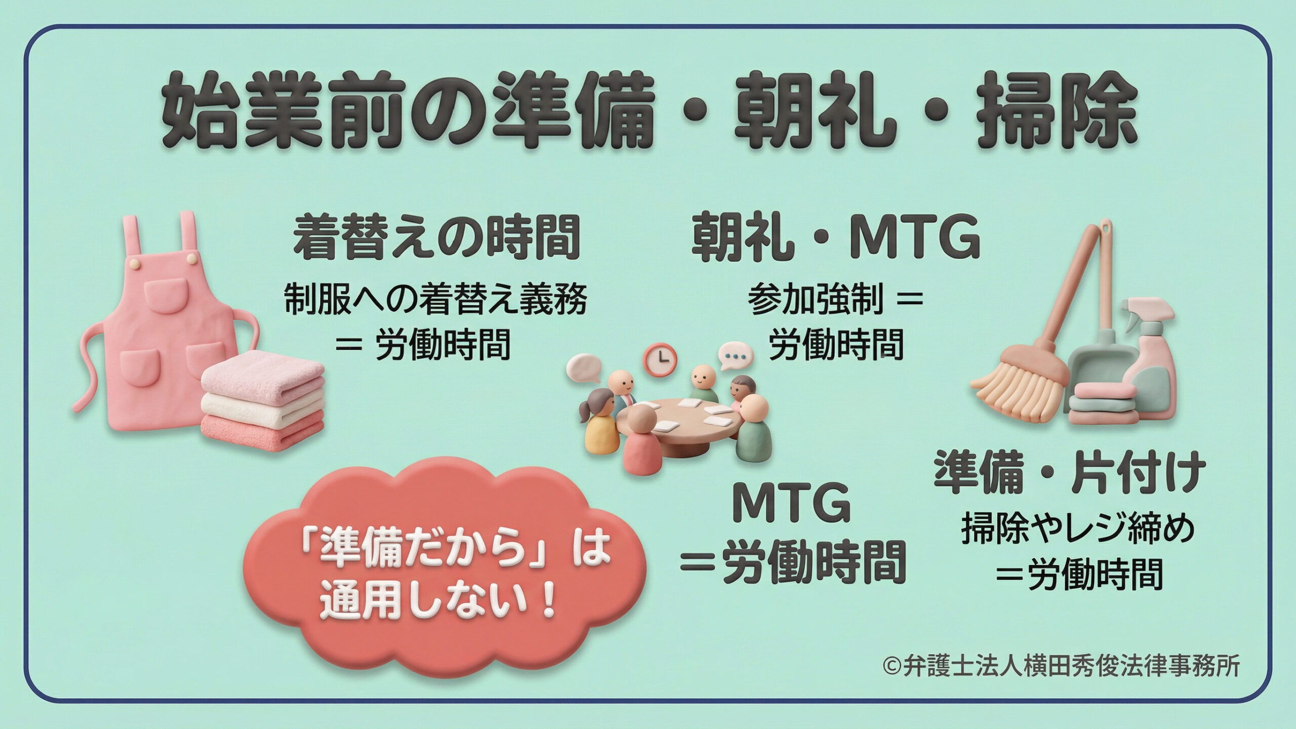 始業前の準備・朝礼・掃除は労働時間に含まれるのか