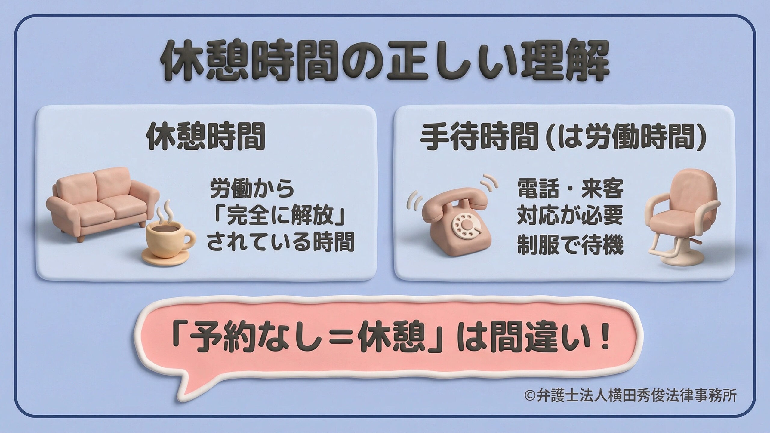 正しい休憩時間とは、例えば「外出が自由である」「電話対応の義務がない」といった状態を確保している時間のことです。