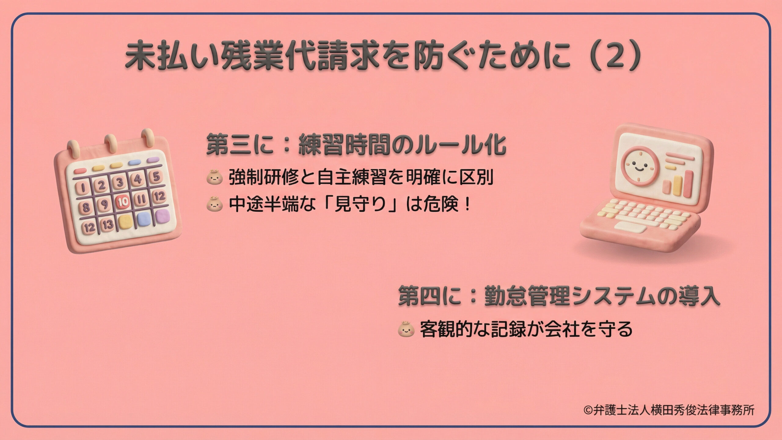 「週に2回は強制的な研修日(労働時間として給与を払う)」「それ以外は完全な自主練習(一切の指導を行わず、場所を貸すだけ)」というように、白黒をはっきりさせることが重要です。中途半端な「見守り指導」が最も危険です。