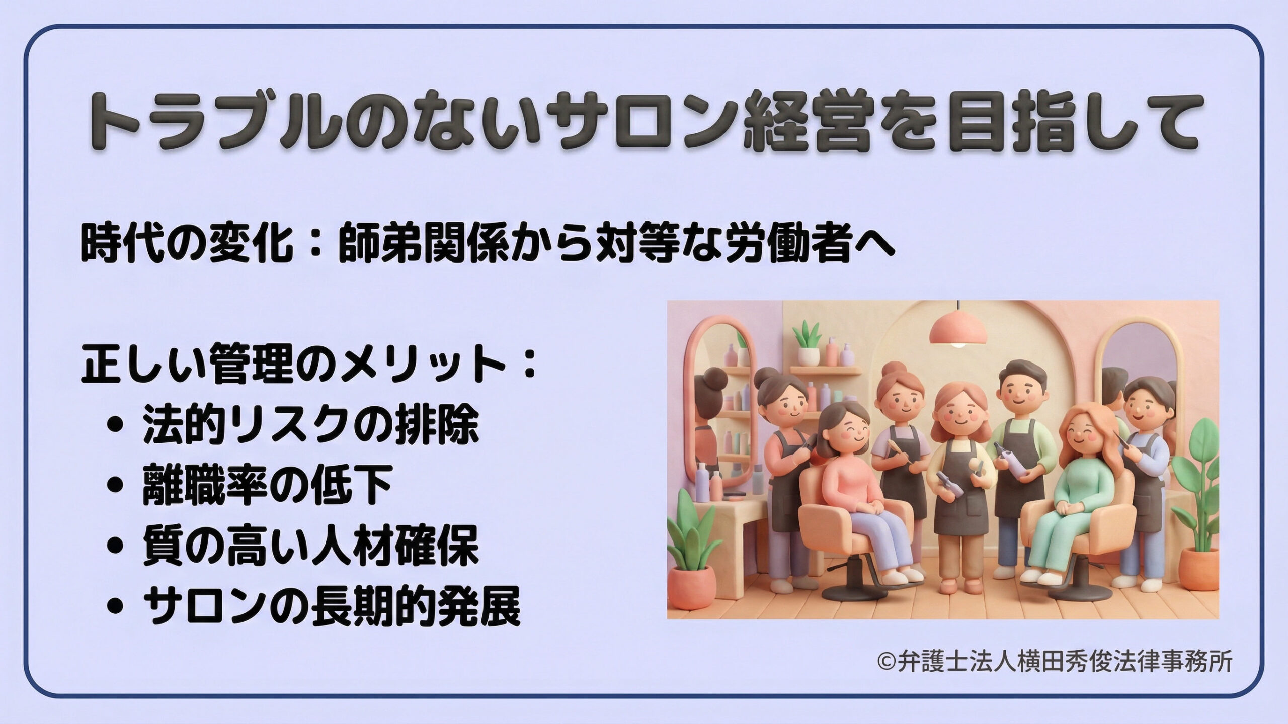 しかし、法的なリスクを排除し、透明性の高い職場環境を作ることは、結果として離職率の低下や質の高い人材の確保につながり、サロンの長期的な発展に寄与します。