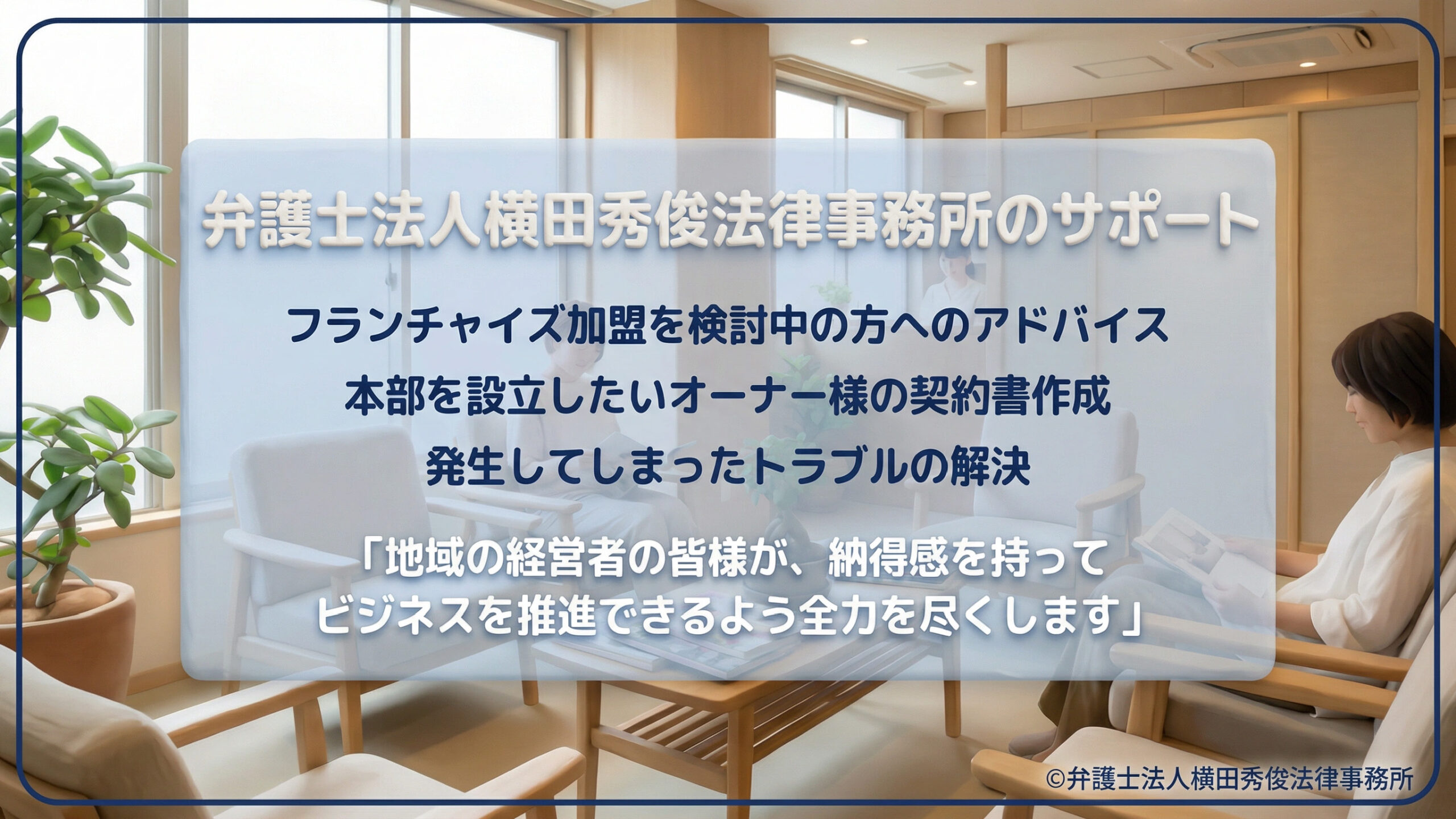 福井県大野市の弁護士法人横田秀俊法律事務所では、FC加盟を検討されている方へのアドバイスから、本部を設立したいオーナー様の契約書作成、さらには発生してしまったトラブルの解決まで、専門的な知見を持ってサポートいたします。