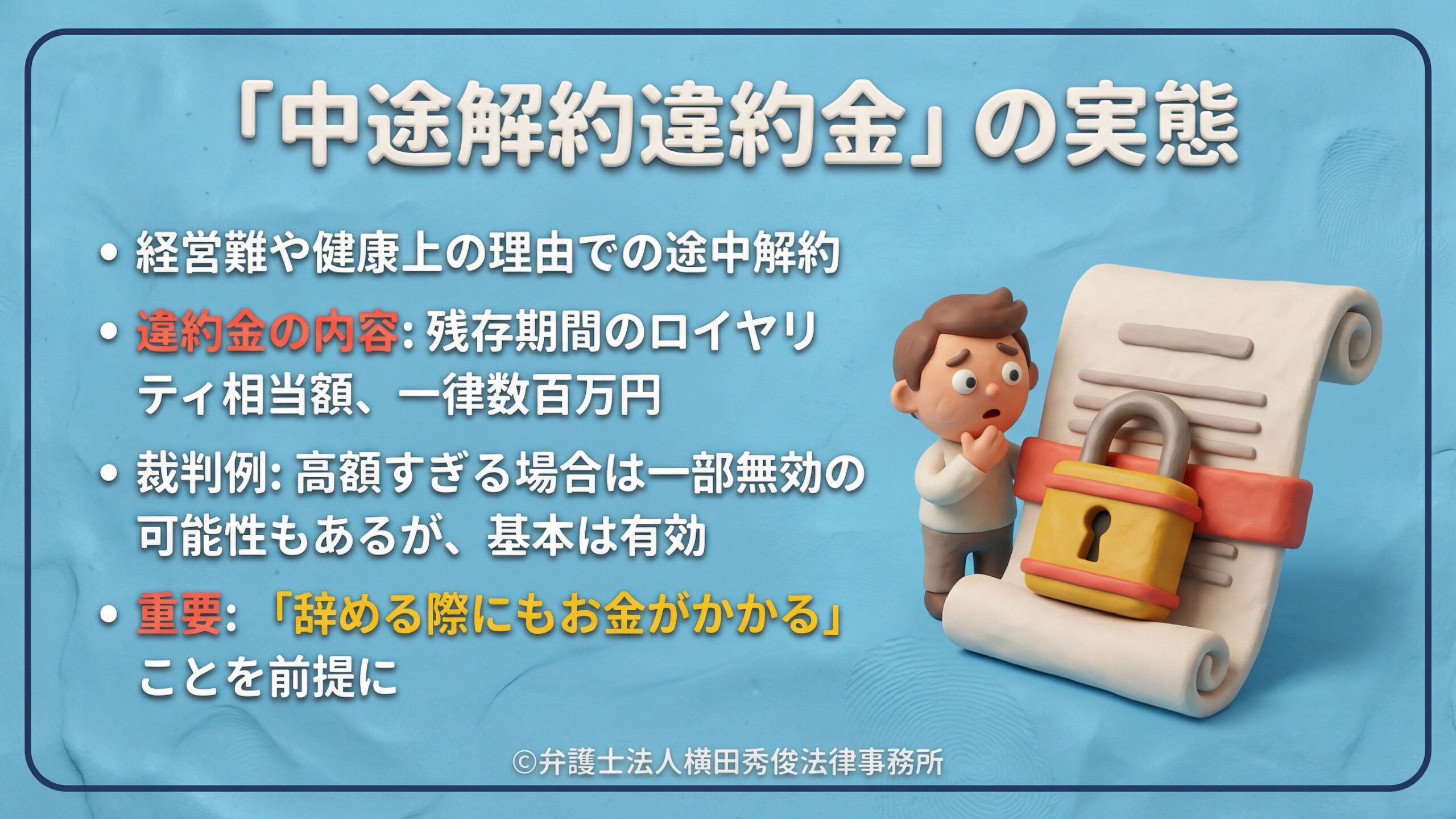この違約金は、本部が投下したブランド維持費用や将来得られたはずの利益を補填するという名目ですが、加盟者にとっては事実上の「足止め」になります。