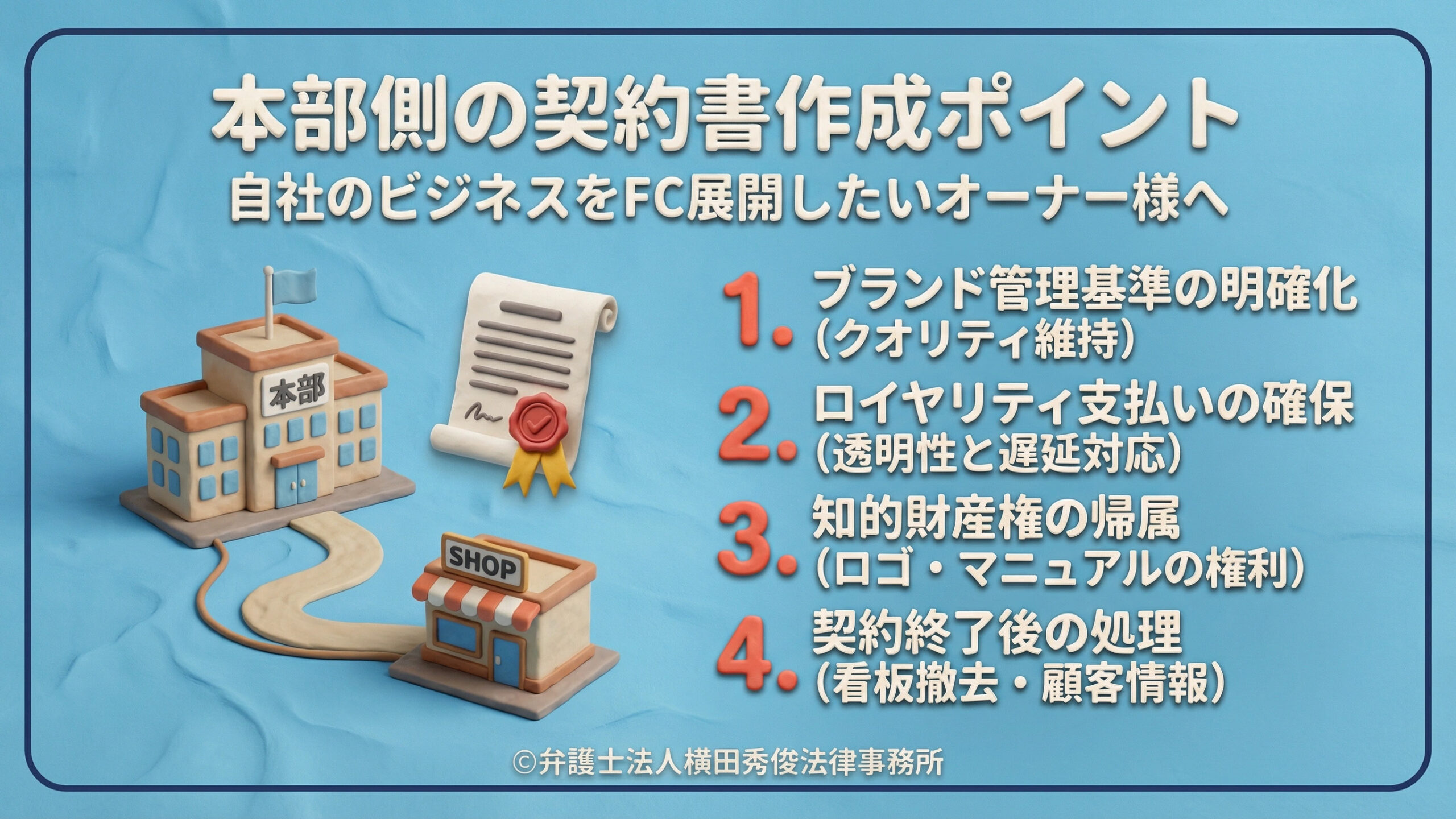 一方で、これから自社のビジネスをFC展開したいと考えているオーナー様(本部側)にとっても、契約書は自らのブランドを守る「盾」であり「剣」です。
