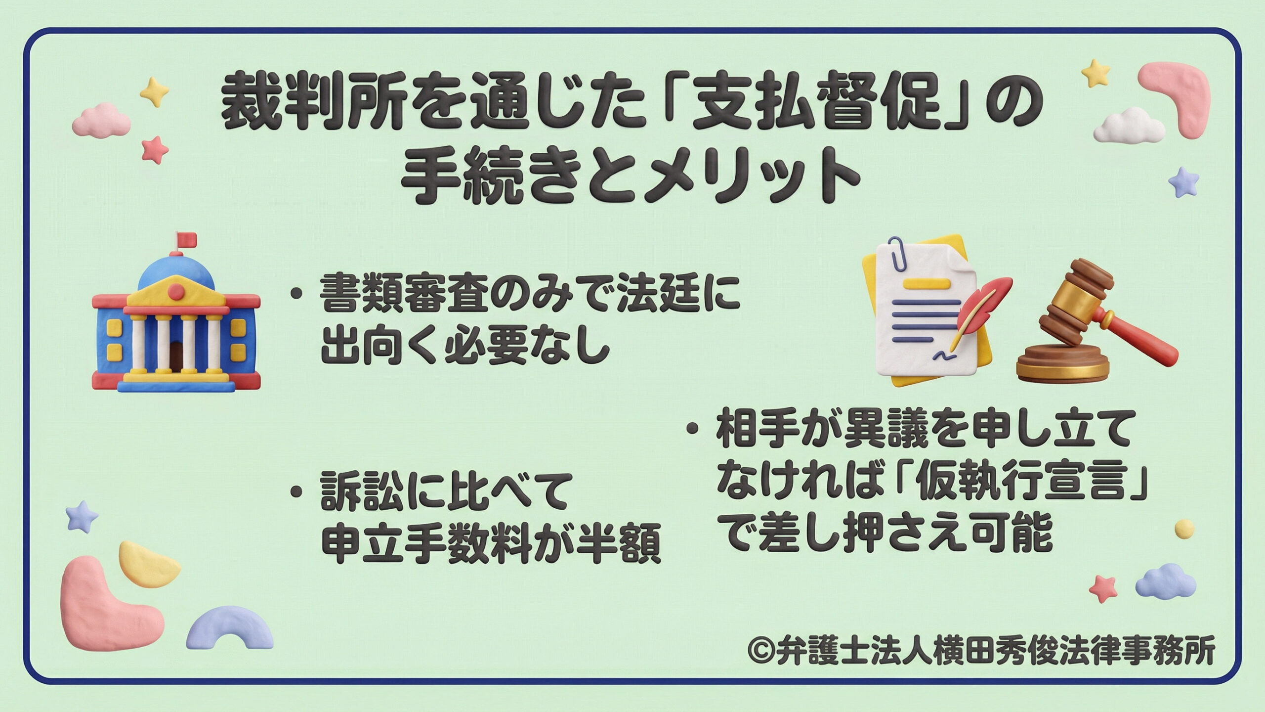 弁護士名での通知でも支払われない場合、次に検討すべきが簡易裁判所の「支払督促」制度です。