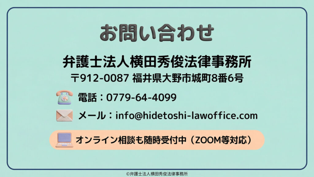 税務リスクを最小限に抑え、健全な経営を維持するために必要な「守りの法務・税務」の知恵を、福井県大野市の弁護士法人横田秀俊法律事務所が分かりやすく解き明かします。