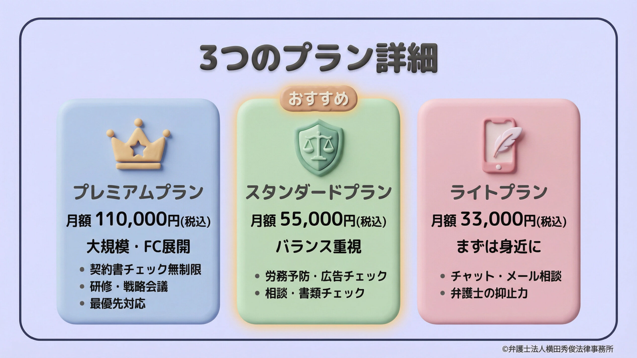 - プレミアムプラン:月額100,000円(税込 110,000円) 大規模サロンやフランチャイズ展開をされている方向け。契約書や規約のチェックが無制限であるほか、スタッフ向けのコンプライアンス研修や、月1回の定例戦略会議が含まれます。トラブル対応時の優先度は最上位となります。