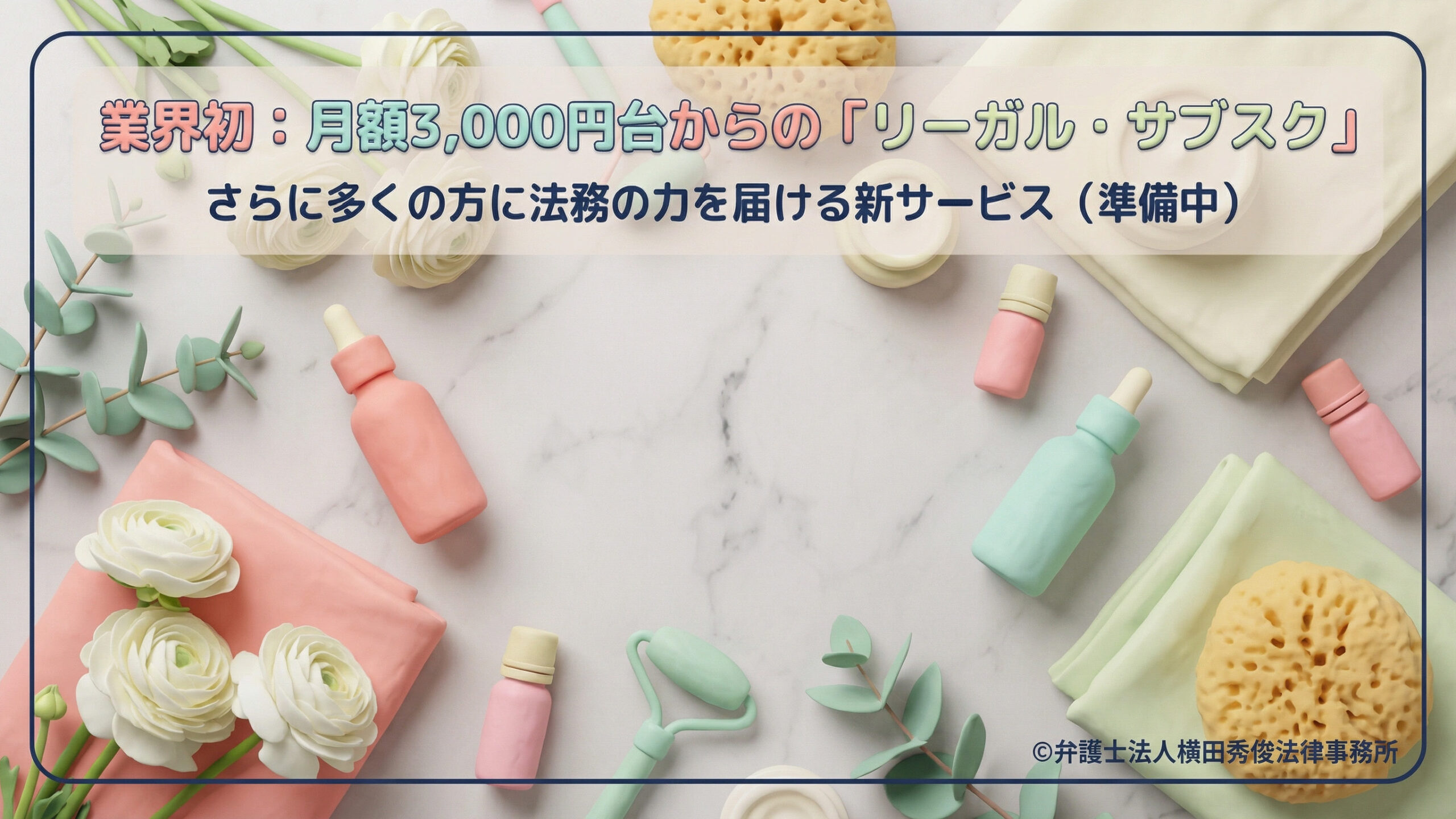 弁護士法人横田秀俊法律事務所では、さらに多くの方に法務の力を届けるべく、新しいサービス形態「リーガル・サブスクリプション」の提供を予定しています。