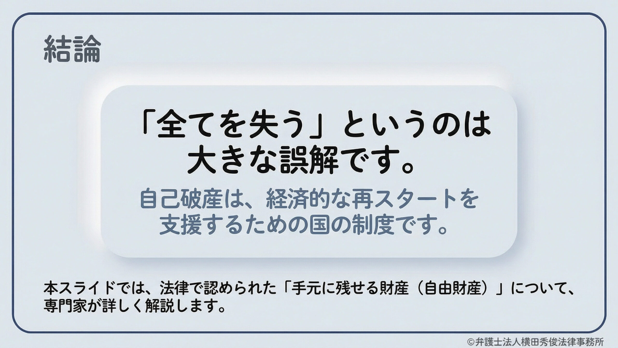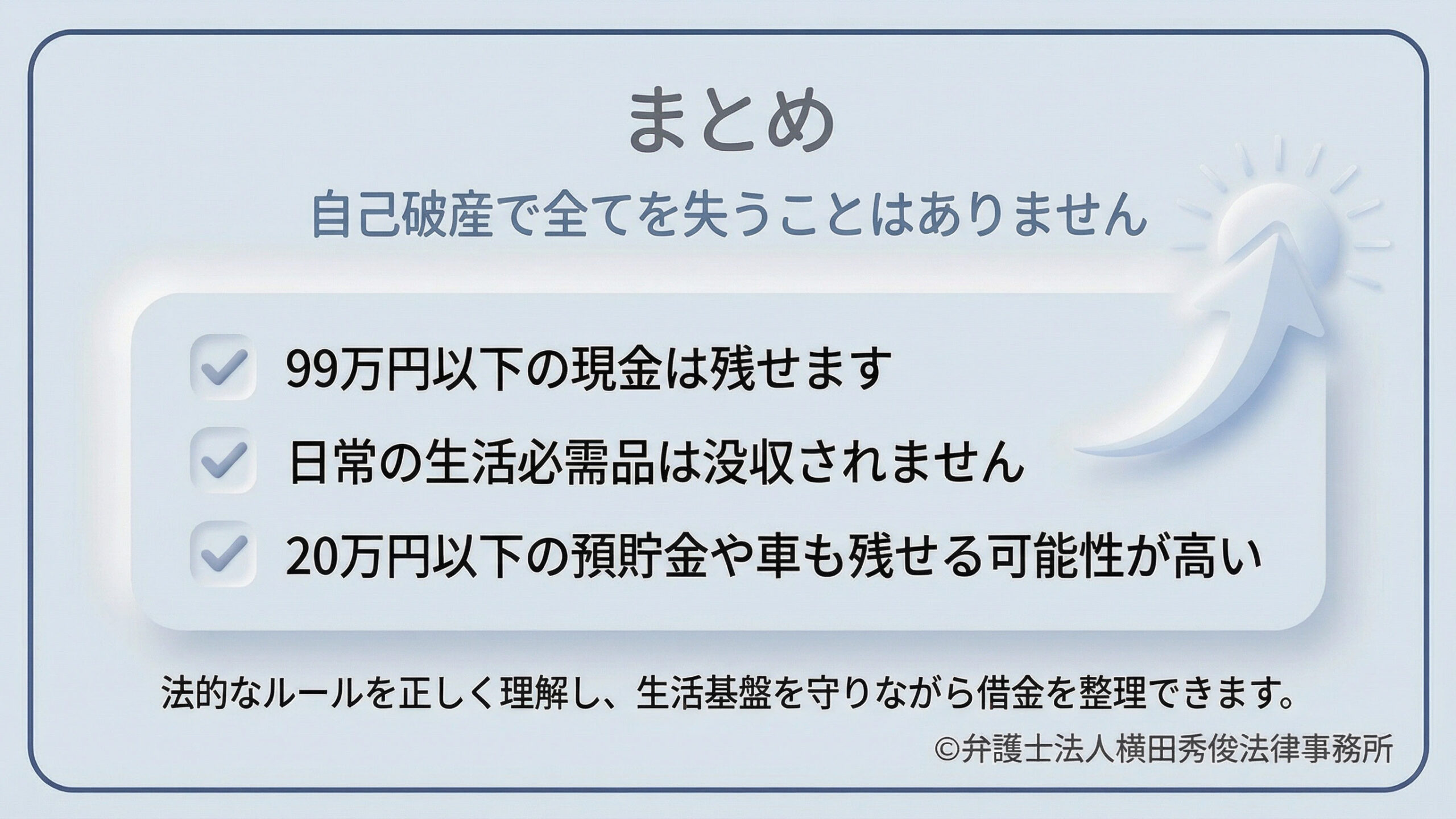 これだけの現金が手元に残れば、破産手続き中やその後の生活を立て直すための大きな足がかりとなります。「自己破産をしたら一銭も残らない」というのは大きな誤解なのです。