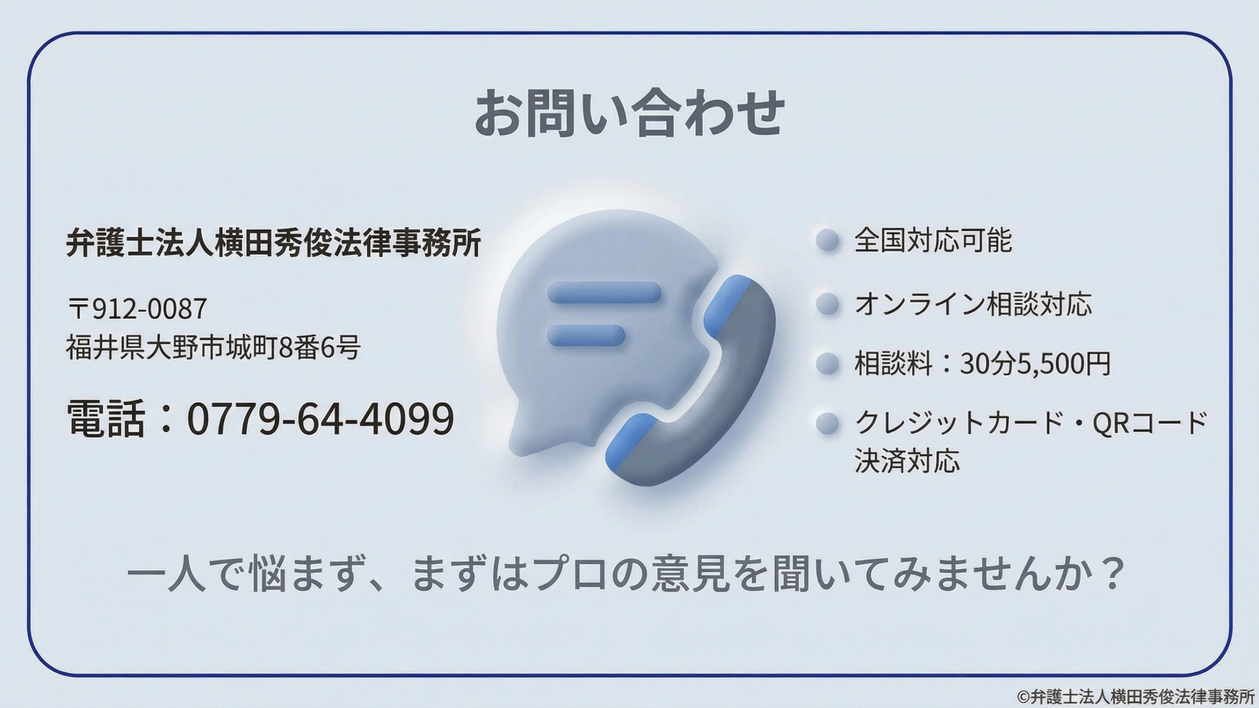 弁護士法人横田秀俊法律事務所は、福井県大野市に事務所を構えておりますが、ご相談は福井県内に限らず、全国各地からのご依頼に対応しております。