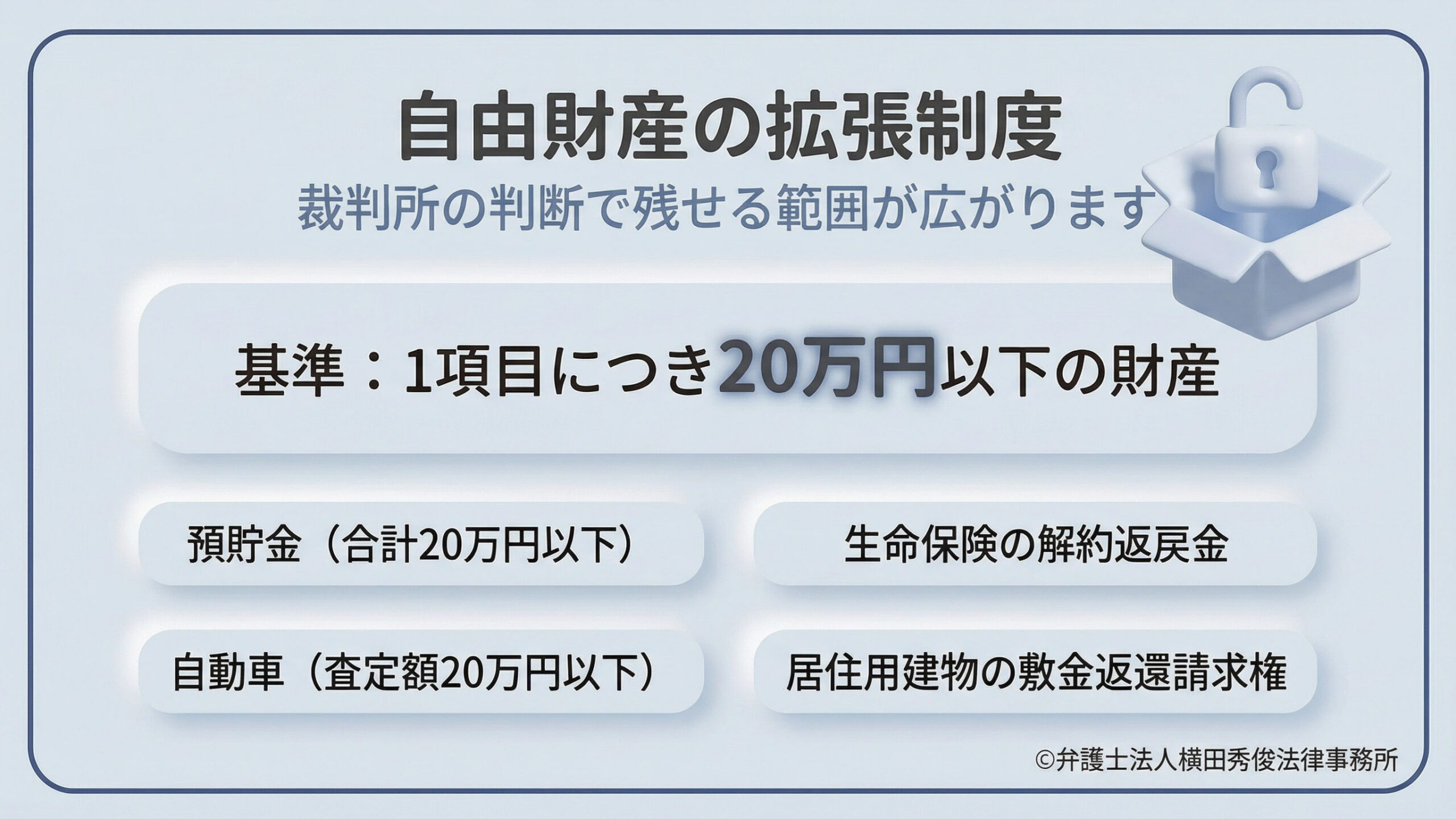 法律で定められた「本来的自由財産」以外にも、裁判所の判断によって「自由財産」として認められる範囲を広げることができます。これを「自由財産の拡張」といいます。