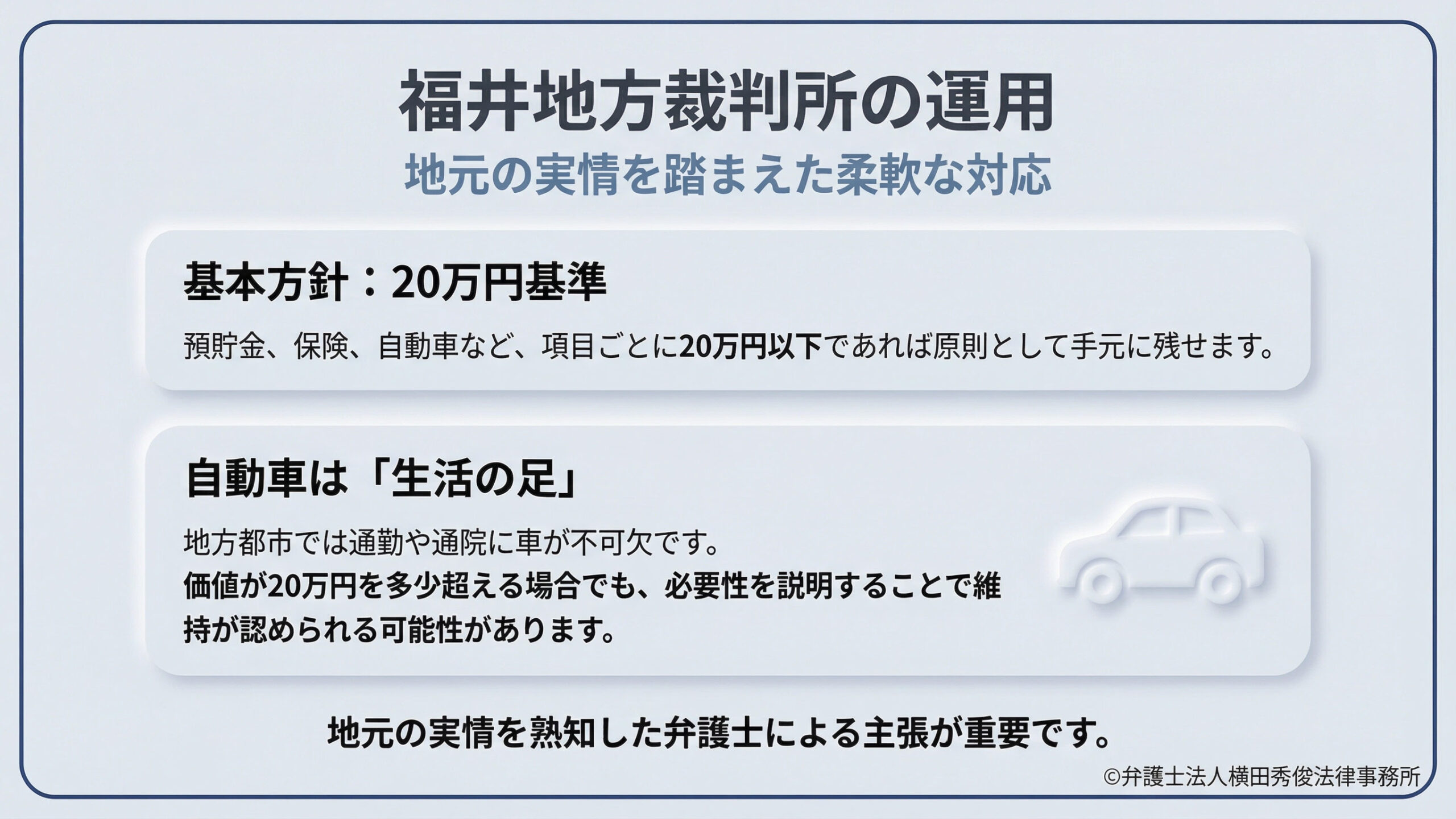 福井地裁では、個別の事情を考慮しつつも、預貯金、保険、自動車などの項目ごとに20万円の基準を適用し、生活再建に支障がないかを慎重に判断してくれます。