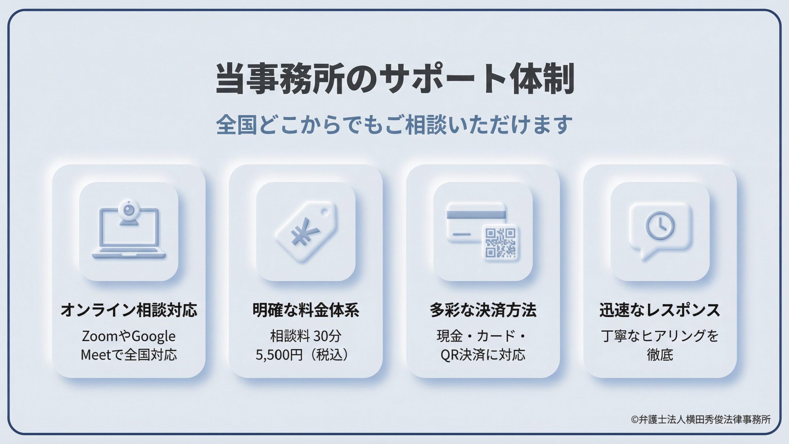 また、ご相談のハードルを少しでも下げるため、以下の体制を整えております。