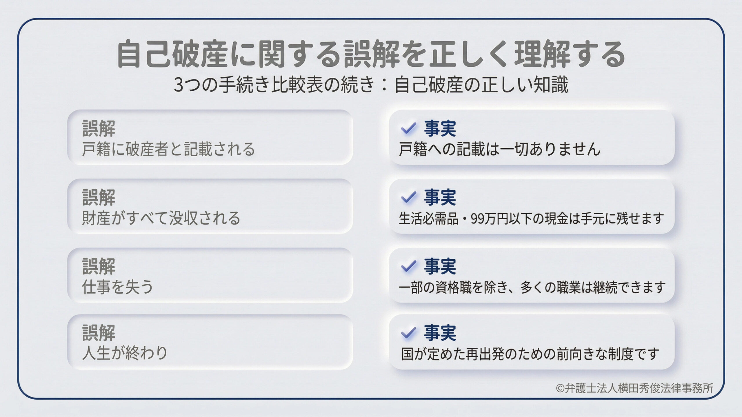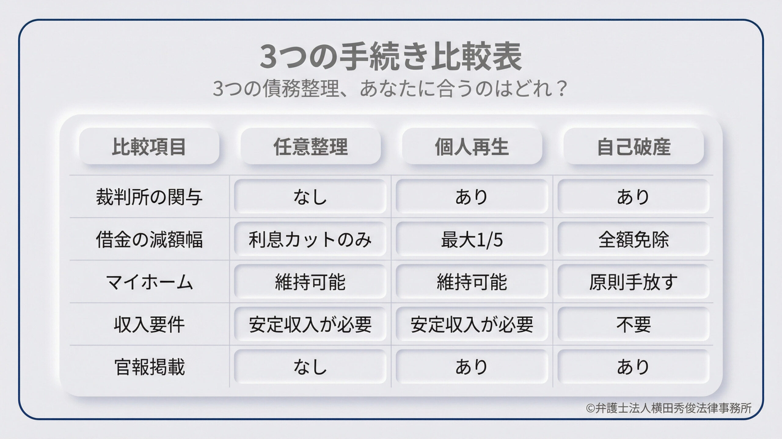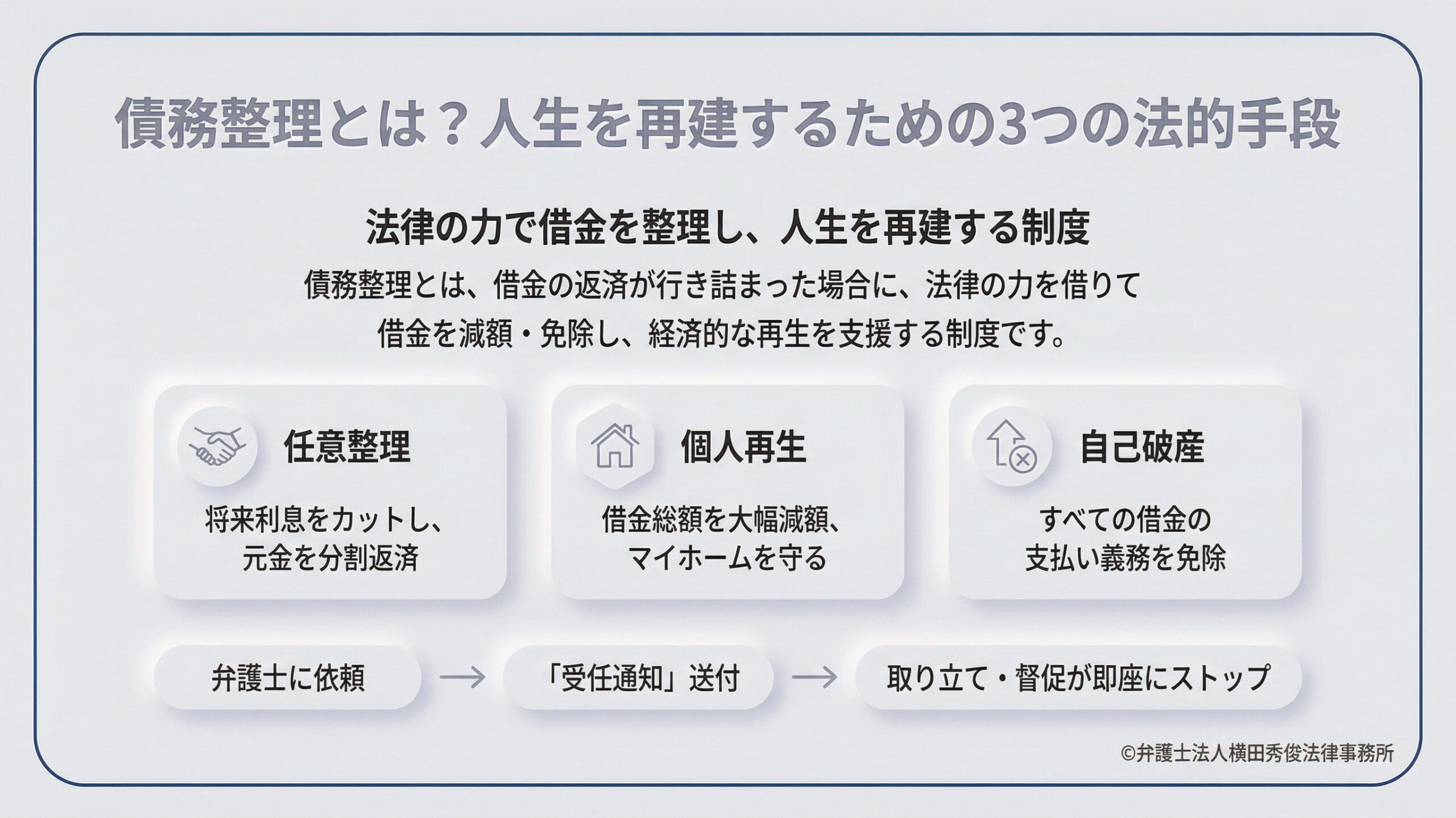 本コラムでは、これら3つの債務整理の根本的な違いと、皆様がご自身の状況に合わせて正しい選択をするための基準について、弁護士法人横田秀俊法律事務所の弁護士が一般の方にも分かりやすい言葉で丁寧に解説いたします。