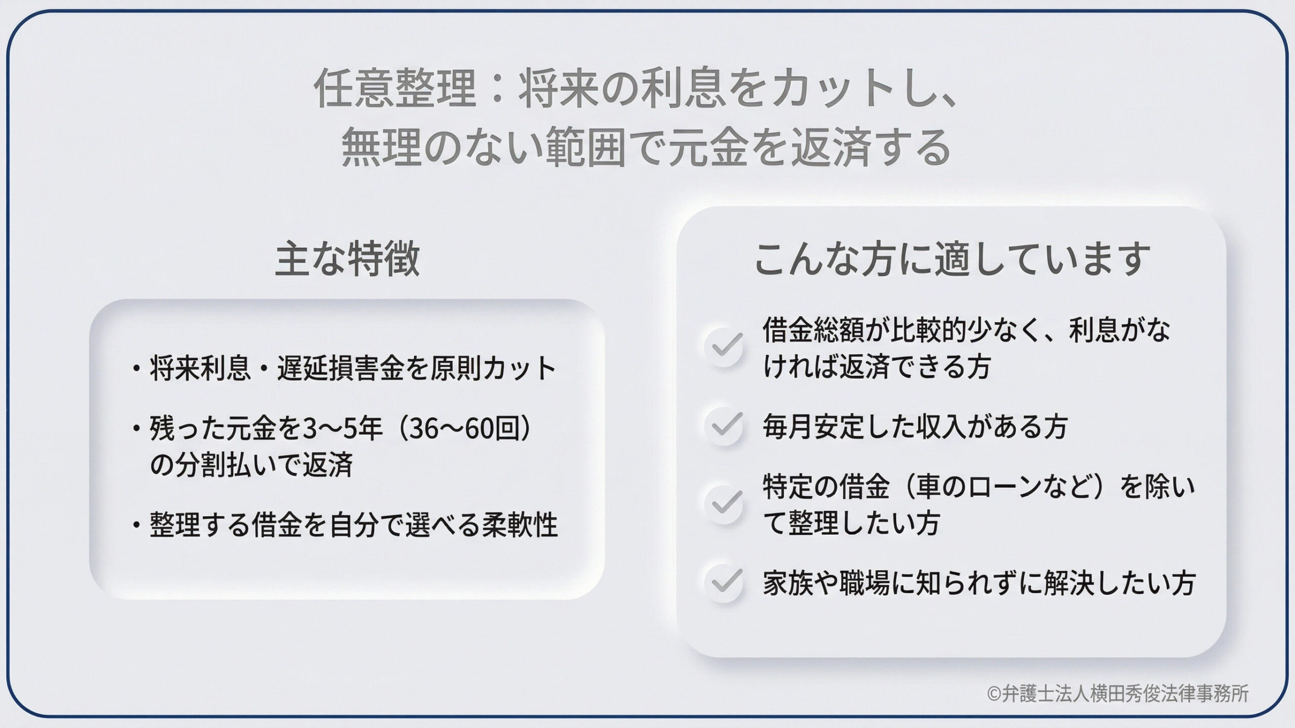 最大の特徴は、交渉が成立した後の【将来利息】や【遅延損害金】を原則としてカット(免除)してもらい、残った借金の元金のみを、3年間から5年間(36回から60回)の分割払いで着実に返済していく点にあります。