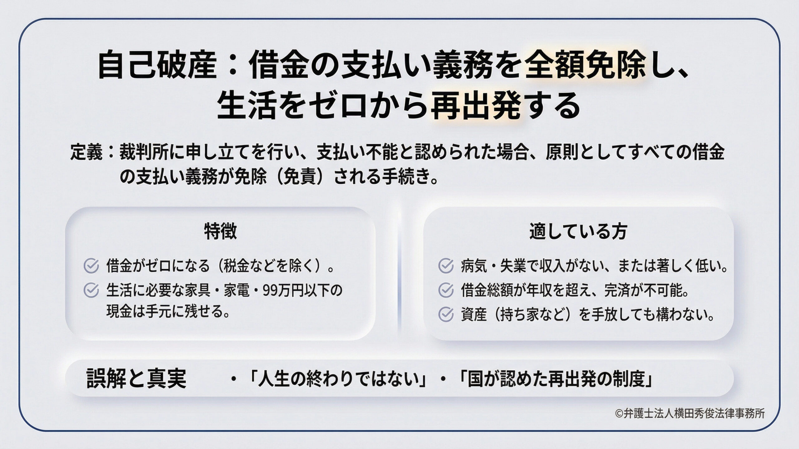 自己破産は、借金で首が回らなくなり追い詰められた方を救済し、もう一度健全な社会生活を送れるようゼロから再出発させるための、国が定めた非常に強力で前向きな制度なのです。