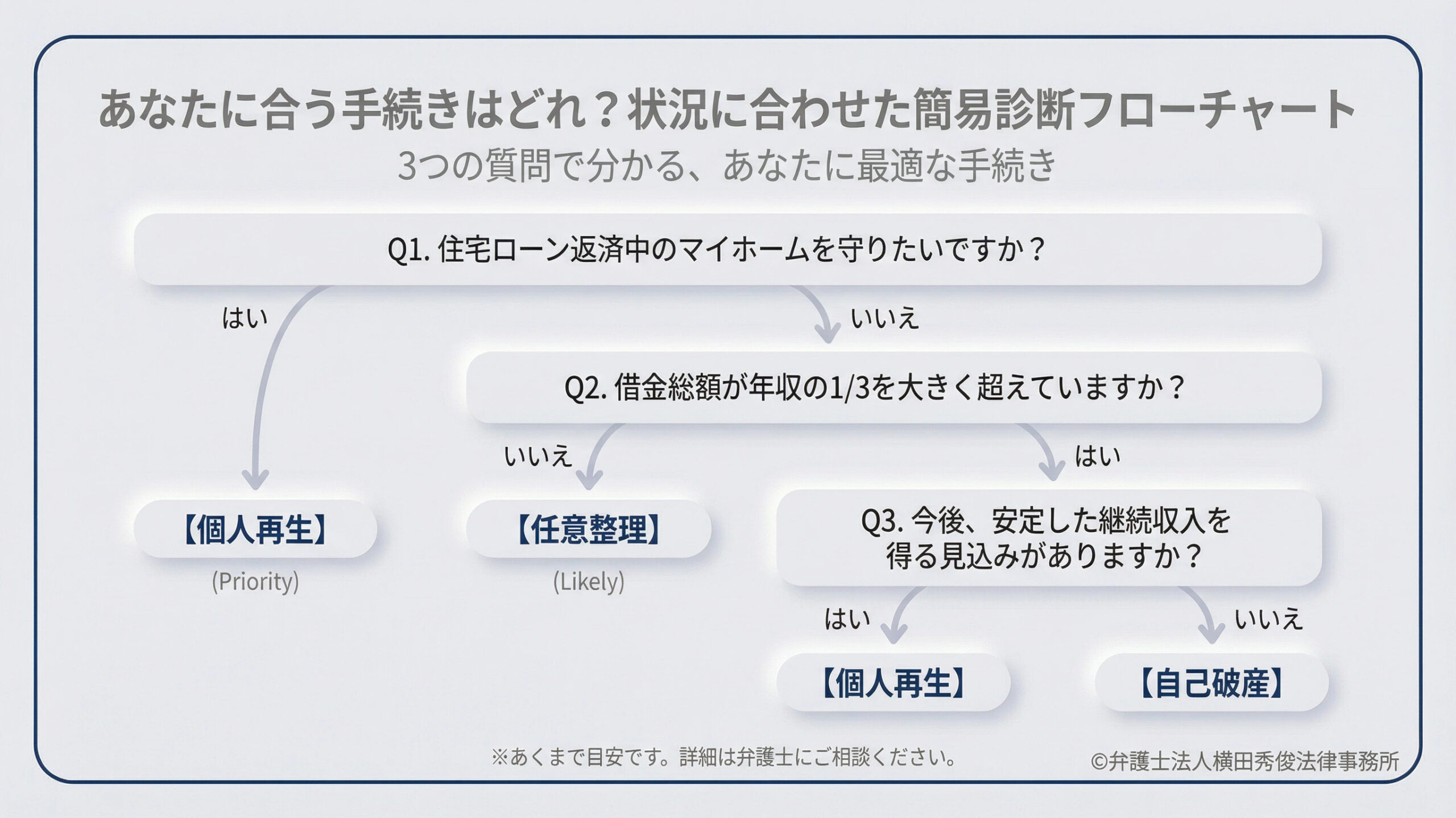 実際の手続きの選択においては、お一人おひとりの細かな家計の収支状況、保有している財産の種類や価値などを総合的かつ専門的に判断する必要があります。