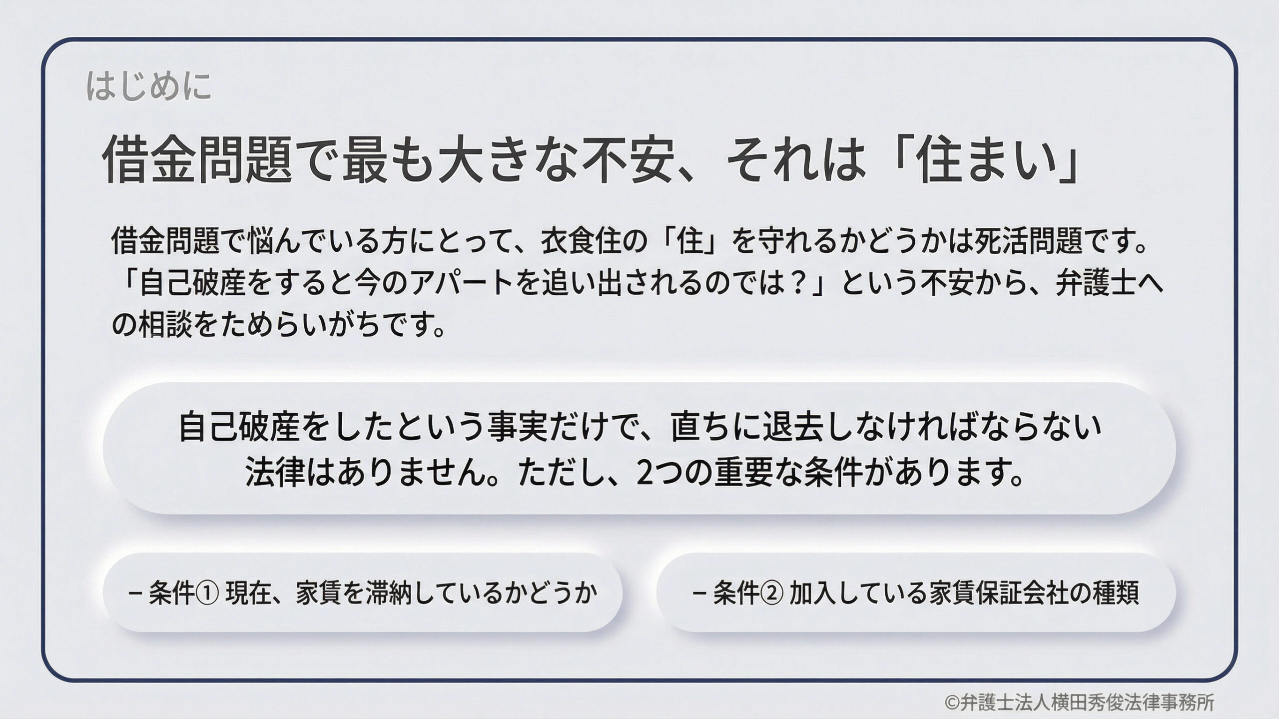 借金問題で悩んでいる方にとって、衣食住の「住」を守れるかどうかは、死活問題に関わる最も大きな不安要素の一つです。