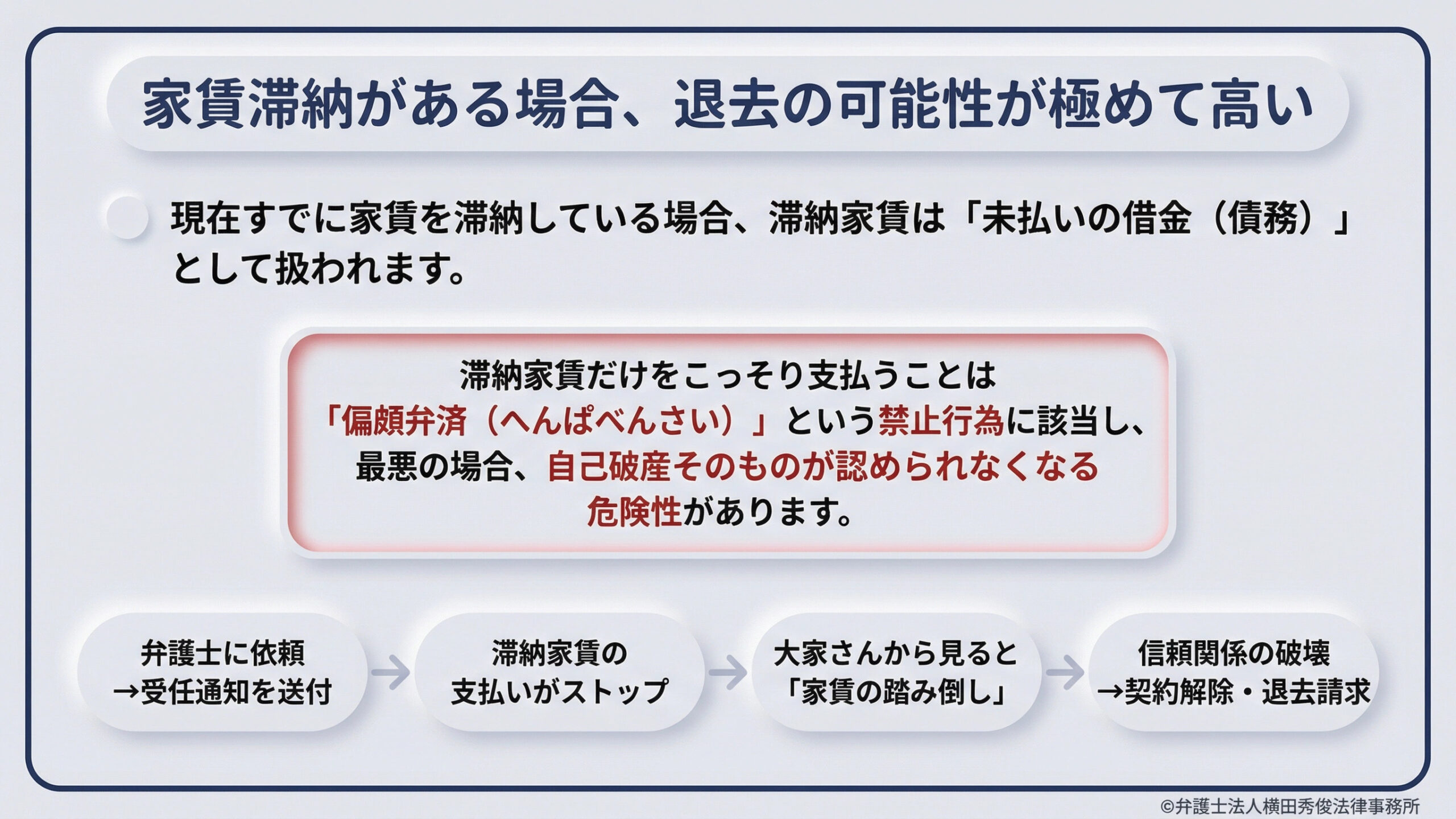 そのため、「アパートを追い出されたくないから」という理由で、消費者金融への返済は止めたのに、滞納している過去の家賃だけをこっそり大家さんに支払うことは、【偏頗弁済(へんぱべんさい)】という禁止行為に該当してしまいます。