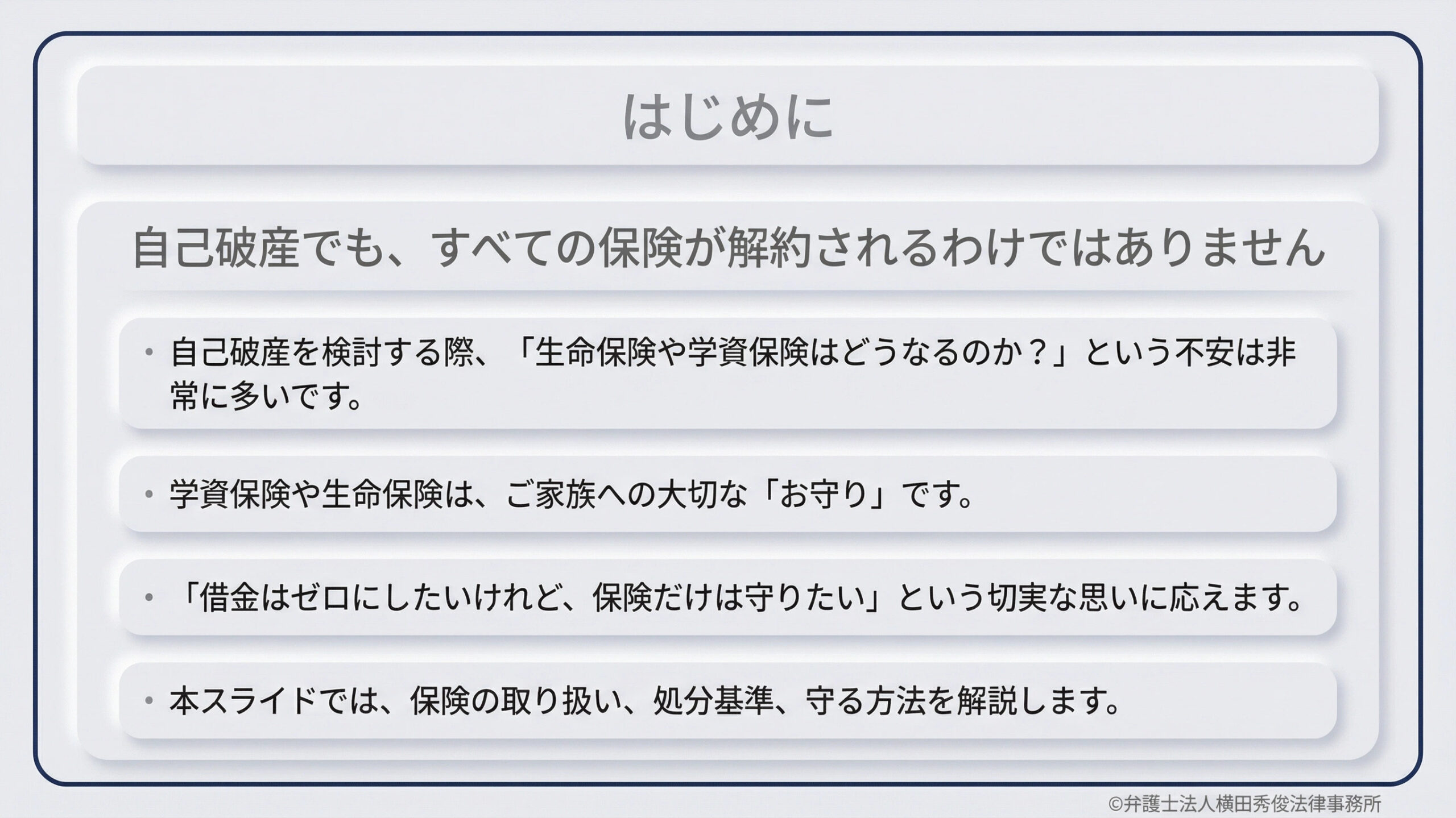 弁護士法人横田秀俊法律事務所では、これまで数多くの債務整理・自己破産事件を手掛け、複雑な保険契約の取り扱いや財産保護に関する豊富なノウハウを蓄積してまいりました。