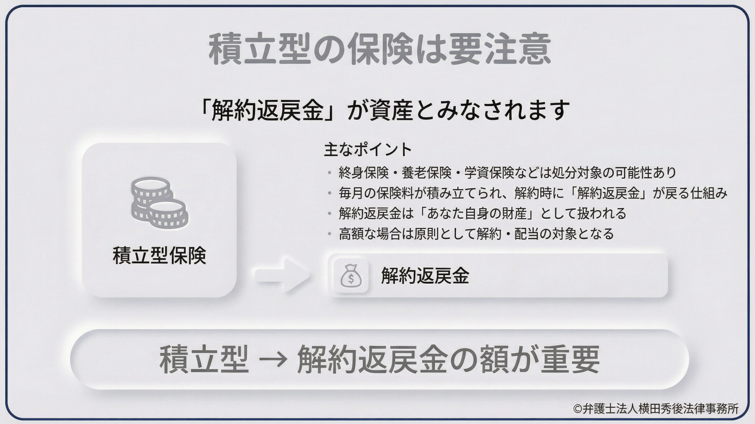 一方で、自己破産において最も注意が必要であり、処分の対象になり得るのが【積立型(貯蓄型)】の保険契約です。