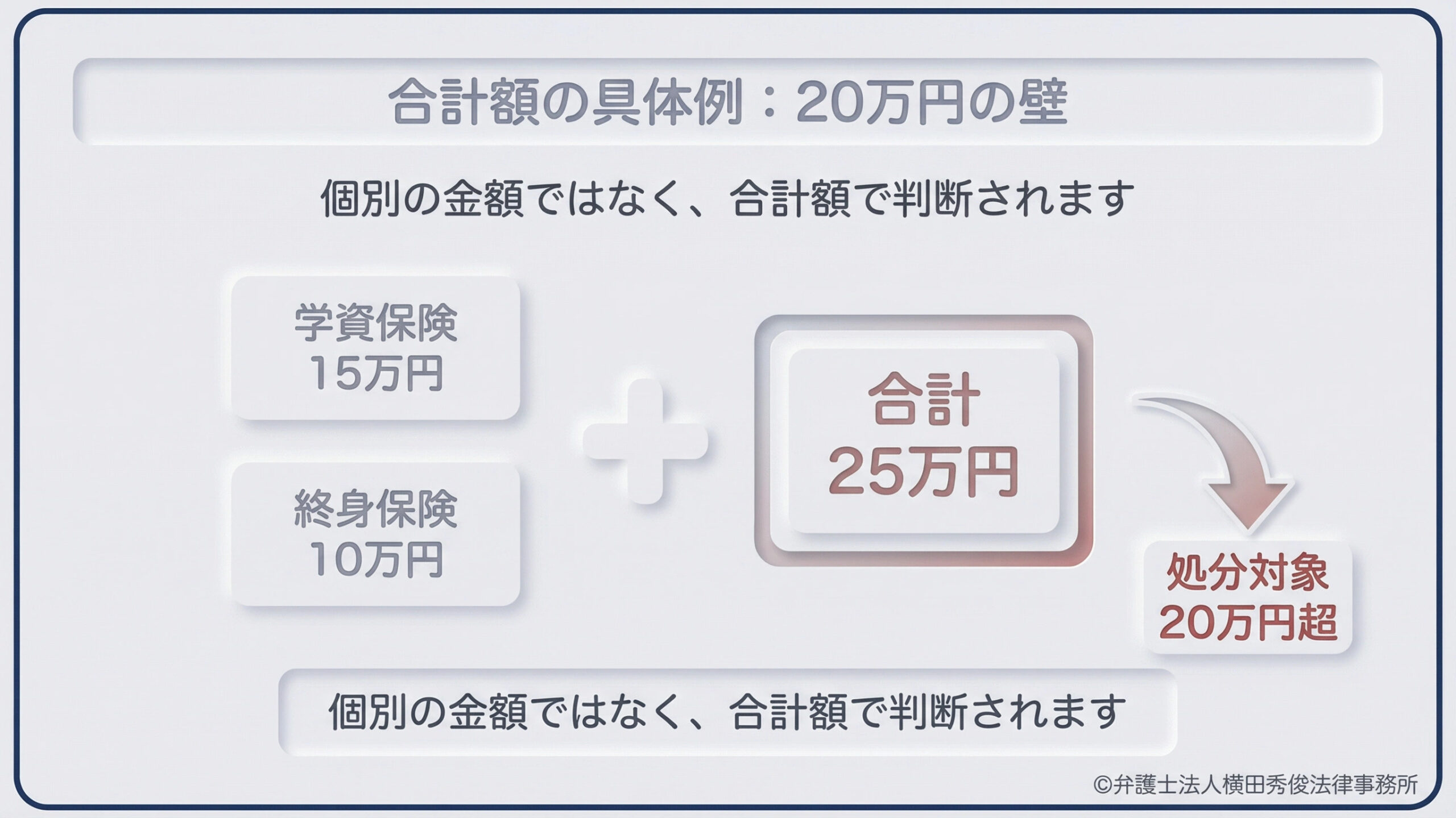 ここで非常に重要な注意点があります。この「20万円」という基準は、1つの保険契約ごとの金額ではなく、【あなたが契約者となっているすべての保険の解約返戻金の「合計額」】で判断されるということです。