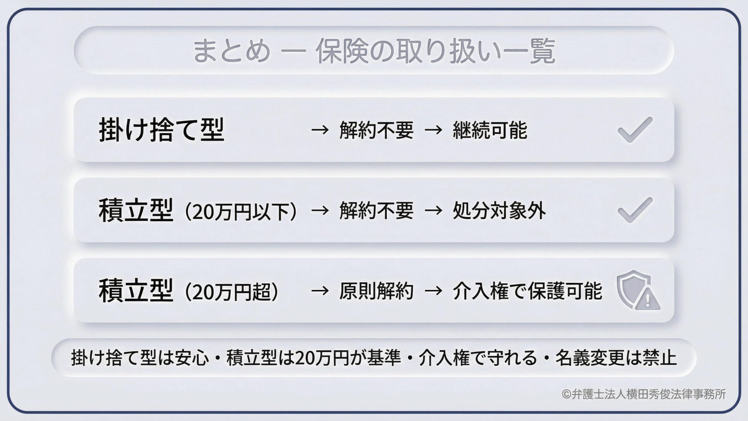 また、仮に解約の対象となってしまう保険であっても、ご親族の協力を得るなどして法的な制度を活用すれば、保険契約そのものを守り抜くことは十分に可能です。