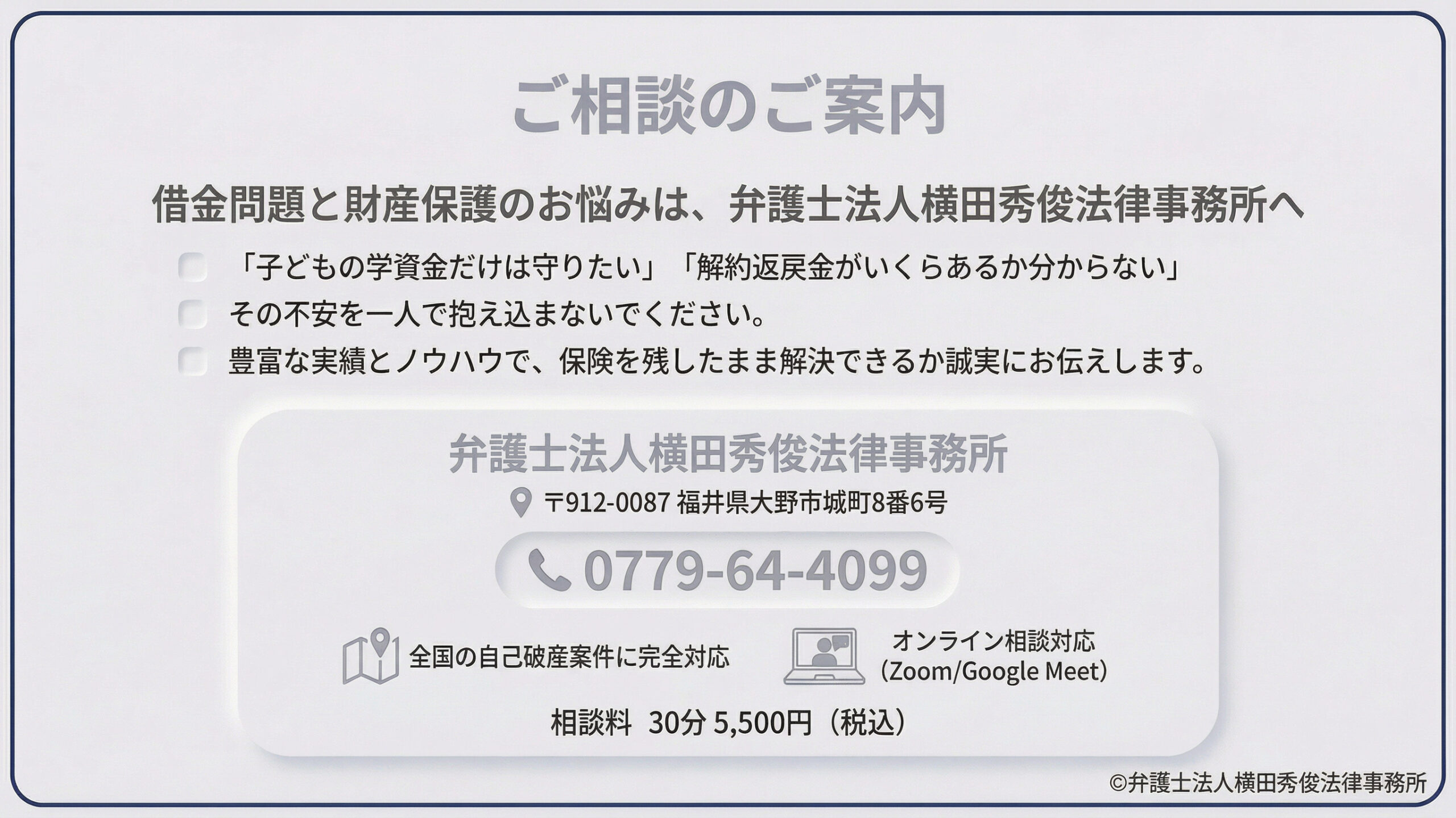 当事務所は福井県大野市にオフィスを構えておりますが、オンライン面談システムを活用し、地域を限定することなく全国の自己破産案件に完全対応しております。借金の返済に行き詰まり、大切な保険を手放す恐怖に怯えている方は、本コラムをお読みいただき、保険を残すための正しい法的知識を身につけた上で、生活再建に向けた第一歩を踏み出してください。