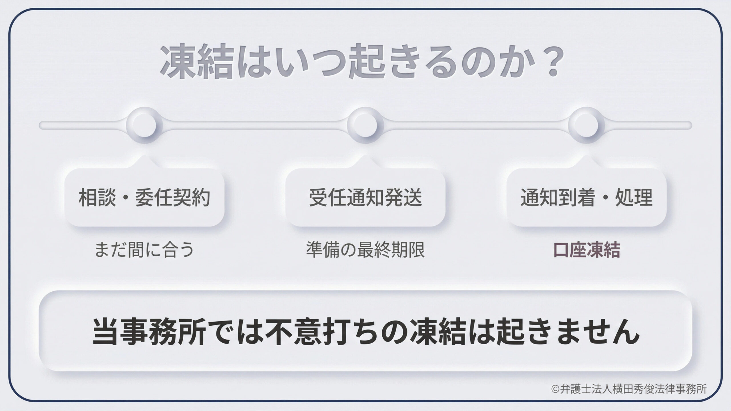 銀行が口座を凍結するのは、弁護士や司法書士から「受任通知(介入通知)」が銀行に届いた時点です。