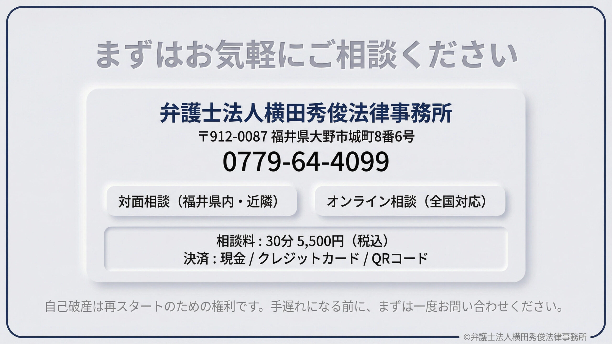 福井県大野市に事務所を構える当事務所ですが、オンライン相談を通じて全国各地のご依頼者様をサポートしております。借金問題は時間との勝負です。