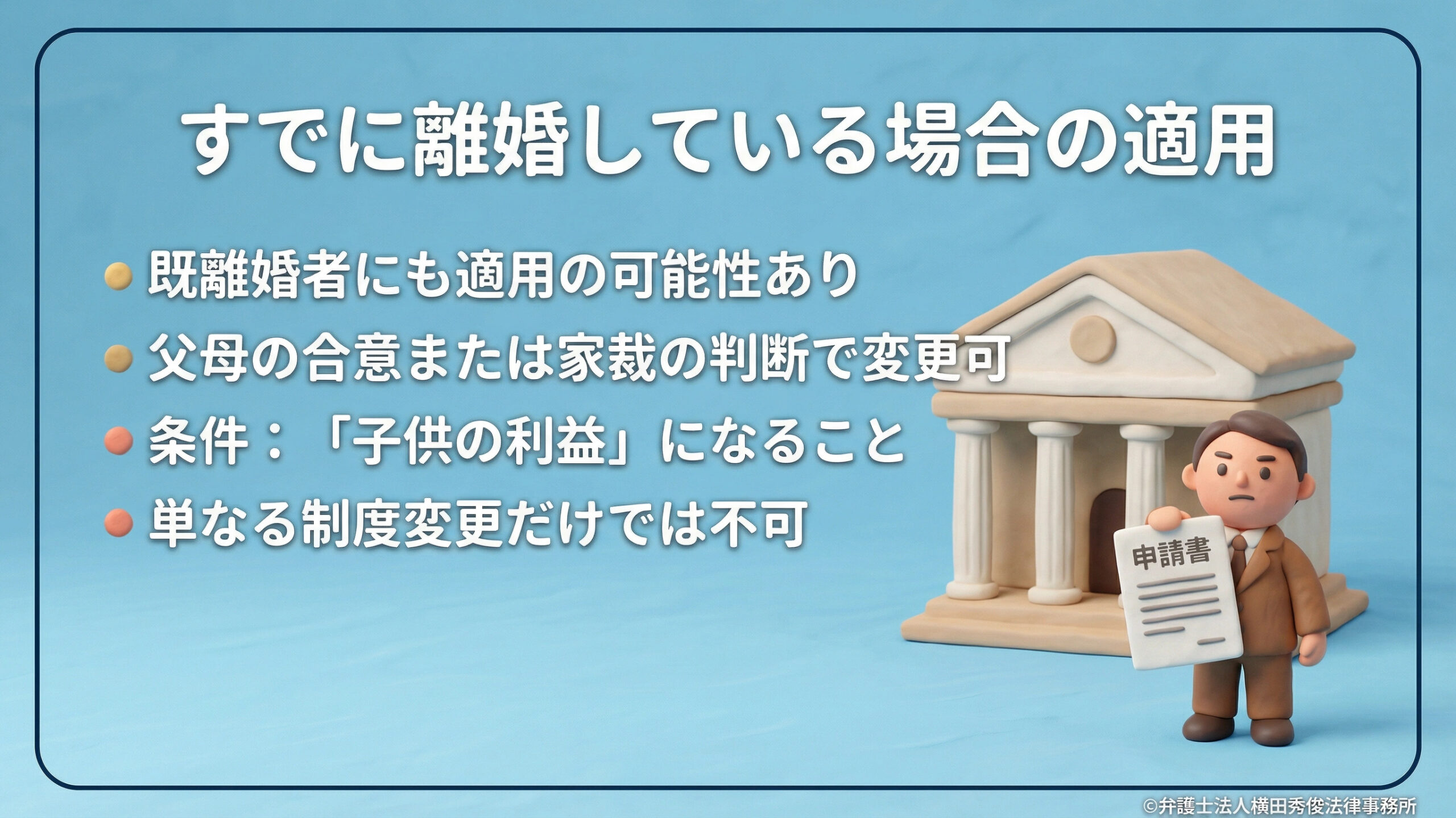ただし、裁判所が親権者の変更を認めるのは、あくまで「変更することが子供の利益になる」と判断された場合に限られます。単に「制度が変わったから権利が欲しい」という理由だけでは認められにくく、これまでの養育実績や子供との関係性が厳しく審査されることになるでしょう。