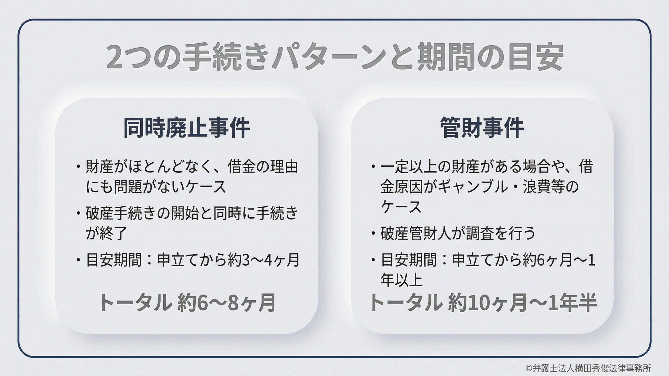 自己破産の手続きにかかる期間は、大きく分けて2つのパターンによって異なります。ご自身の財産状況や借金の理由によって、裁判所がどちらの手続きで進めるかを判断します。