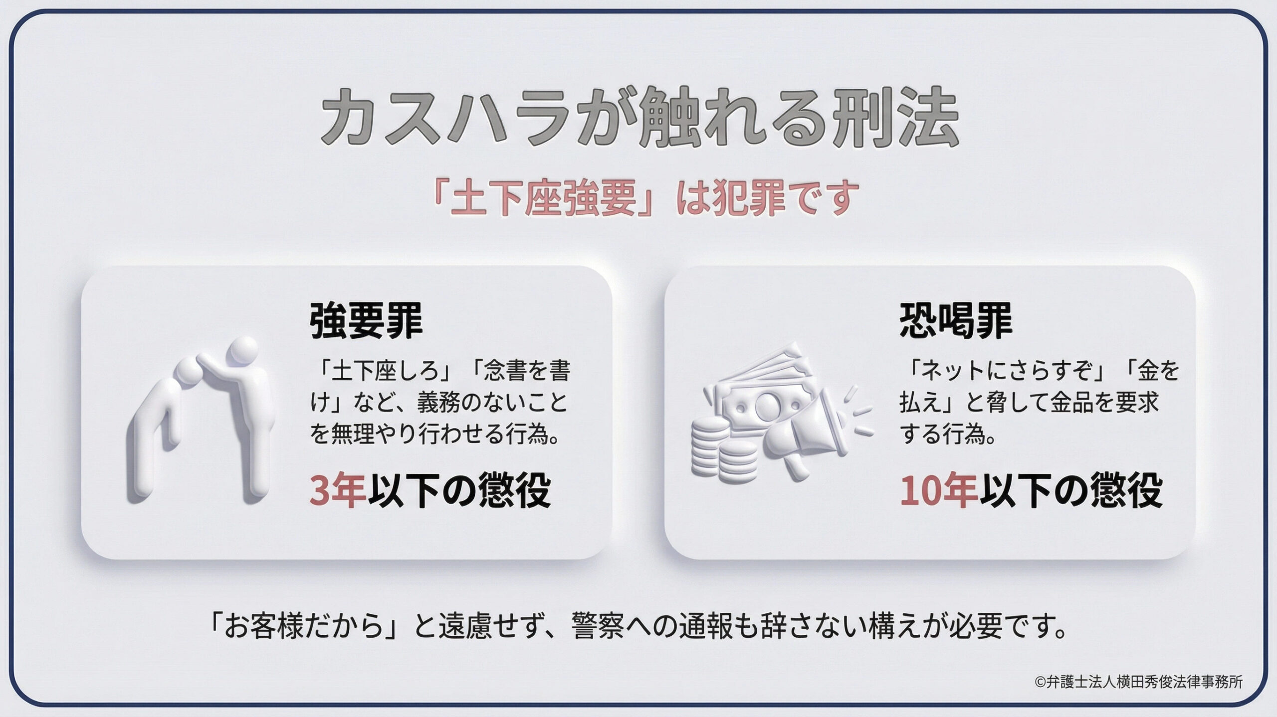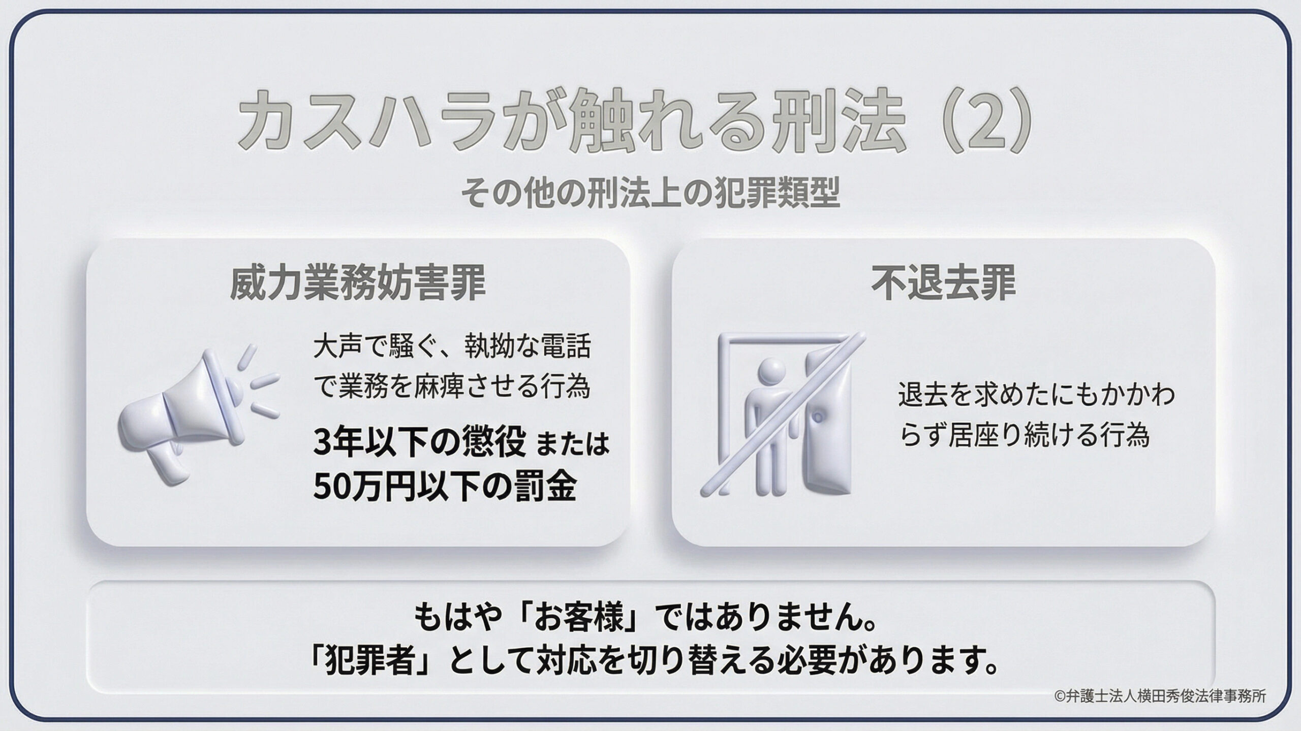カスハラは、民事上のトラブルにとどまらず、刑法上の犯罪に該当するケースが多々あります。