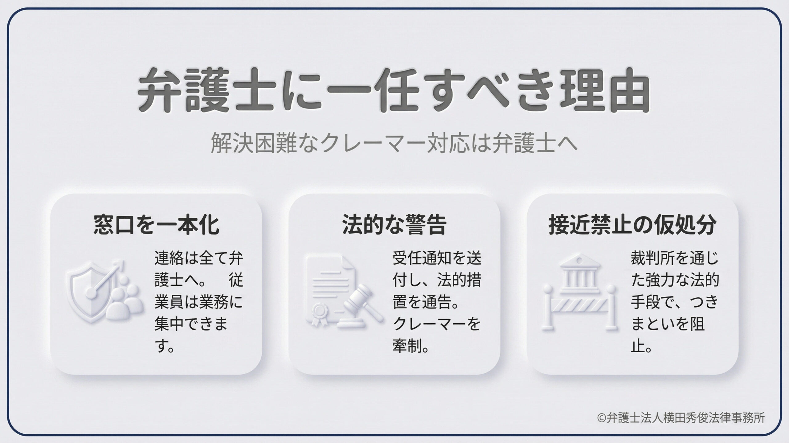 弁護士名で「受任通知」を送付し、これ以上の不当な要求や業務妨害行為があれば、法的措置(損害賠償請求や刑事告訴)をとると通告します。多くのクレーマーは、弁護士が出てきた時点でトーンダウンします。