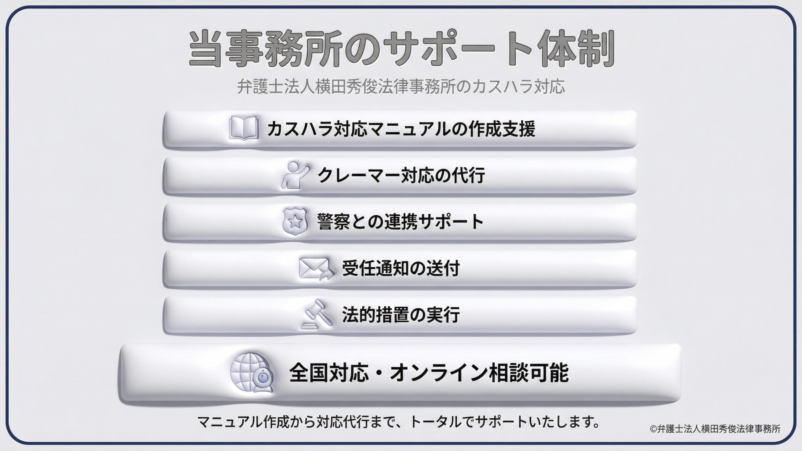 マニュアルの作成から、実際のクレーマー対応の代行、警察との連携まで、トータルでサポートいたします。