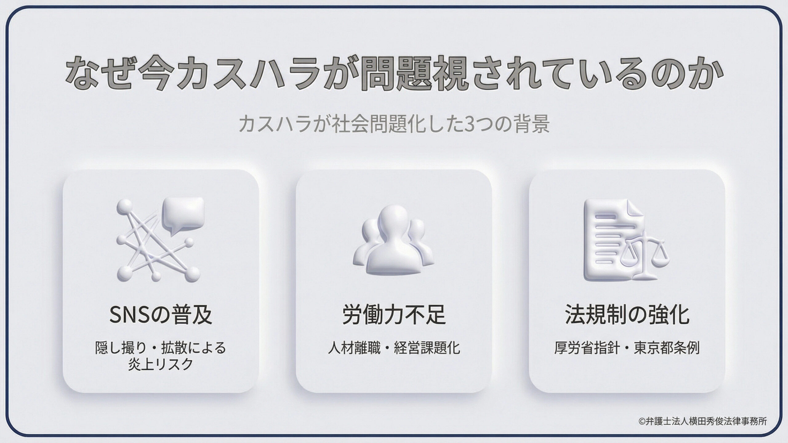 近年、カスタマーハラスメント(以下、カスハラ)が急速に社会問題化した背景には、いくつかの要因があります。