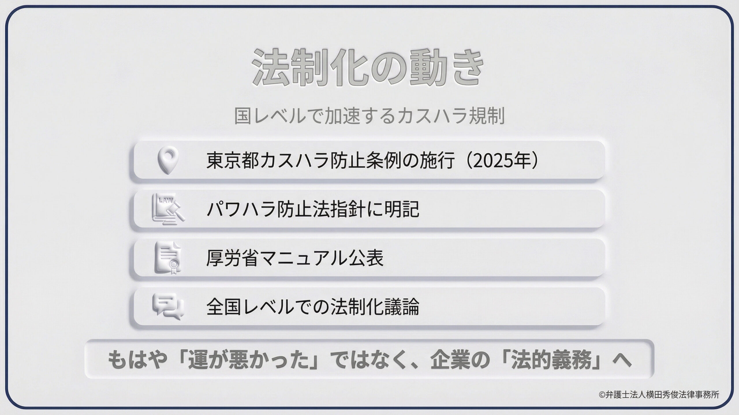 東京都で日本初のカスハラ防止条例が施行されてから1年が経過し、国レベルでも法制化に向けた動きが加速しています。もはやカスハラは「運が悪かった」で済まされる問題ではなく、企業が取り組むべき「法的義務」となりつつあります。