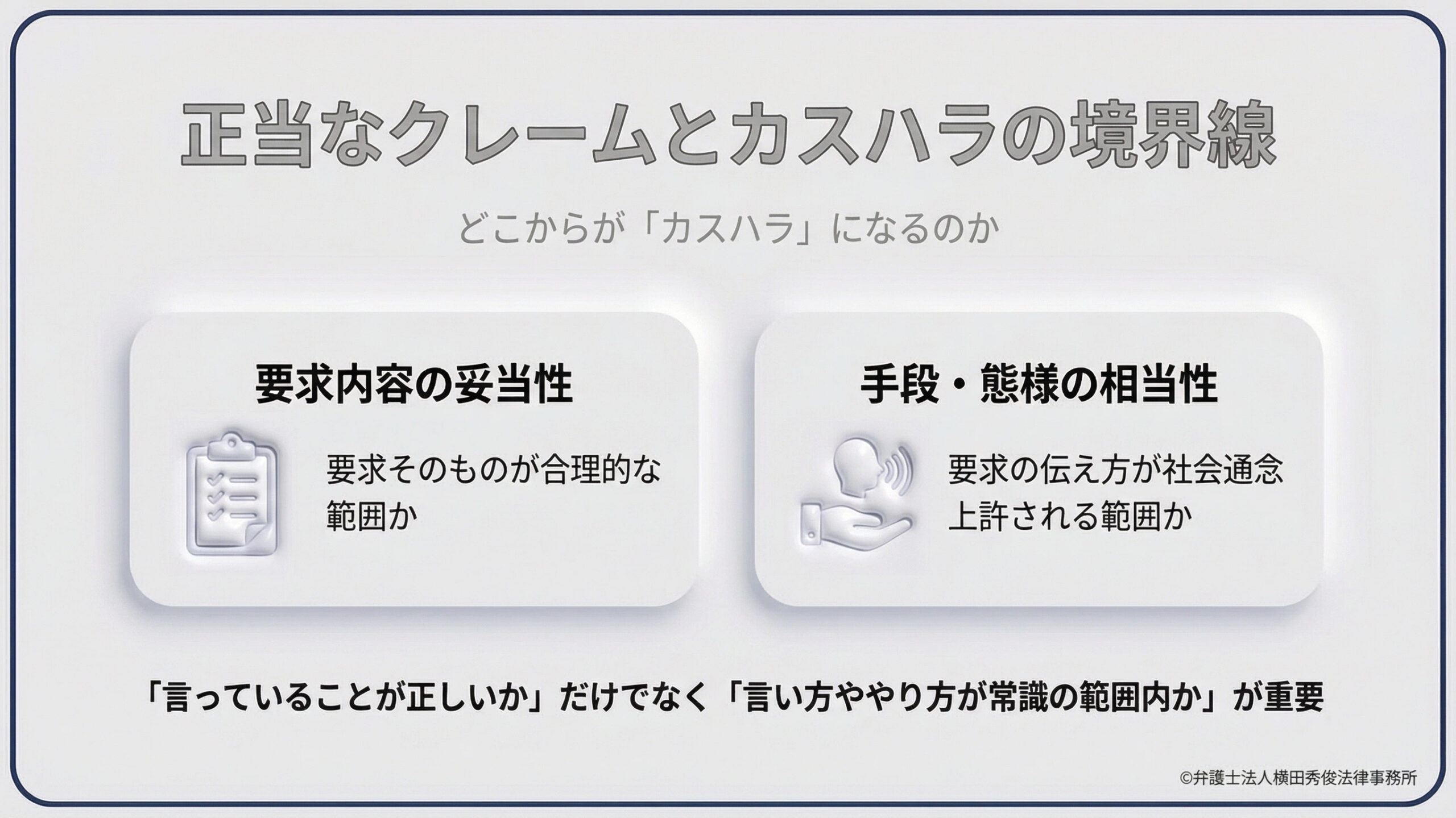 しかし、その「手段」や「態様」が社会通念上許される範囲を超えた場合、それはカスハラとなります。